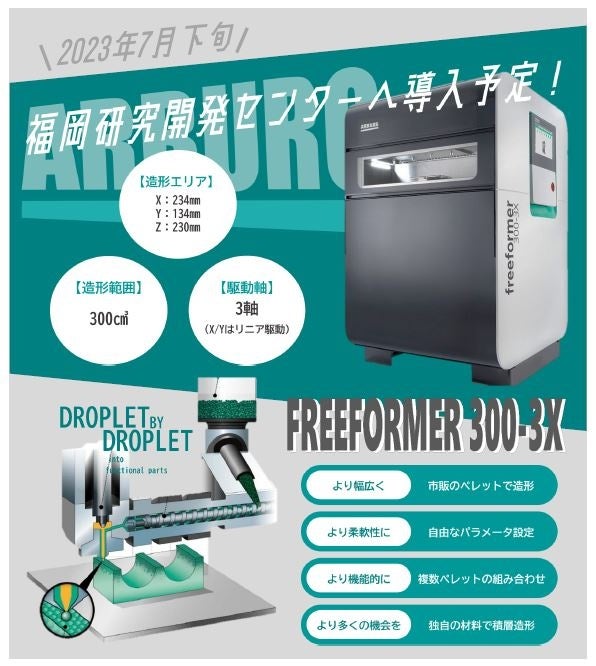【ARBURG】FREEFORMER300-3X導入し従来の射出成形に使用されているペレット材が3Dプリント可能!2023年7月23日弊社福岡研究開発センターに設備搬入 設置完了。