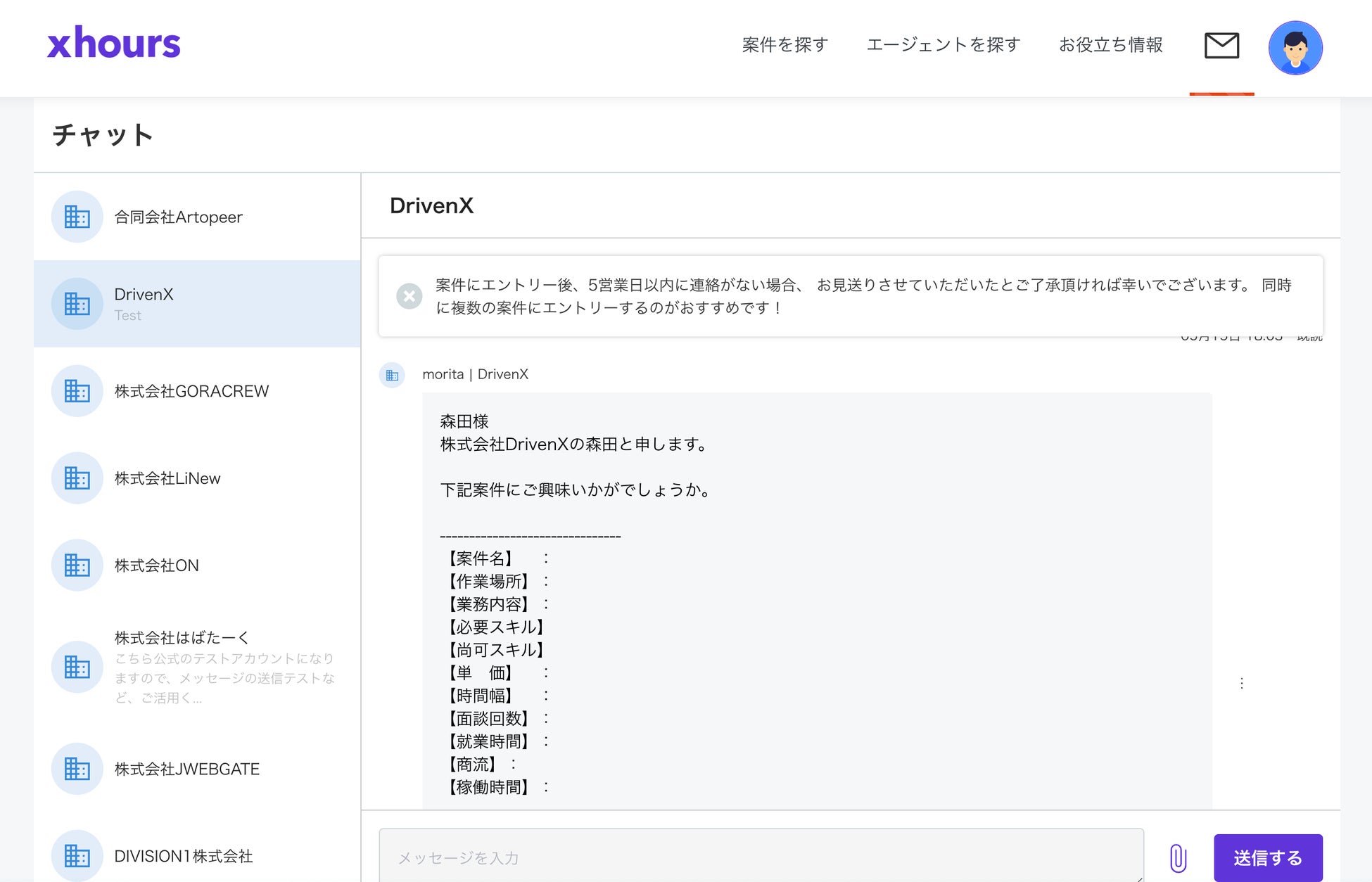 当社は元フリーランスエンジニア森田が創業し、企業とITフリーランスを直接繋げるダイレクトマッチングプラットフォーム「xhours(エックスアワーズ)」(https://x-hours.com