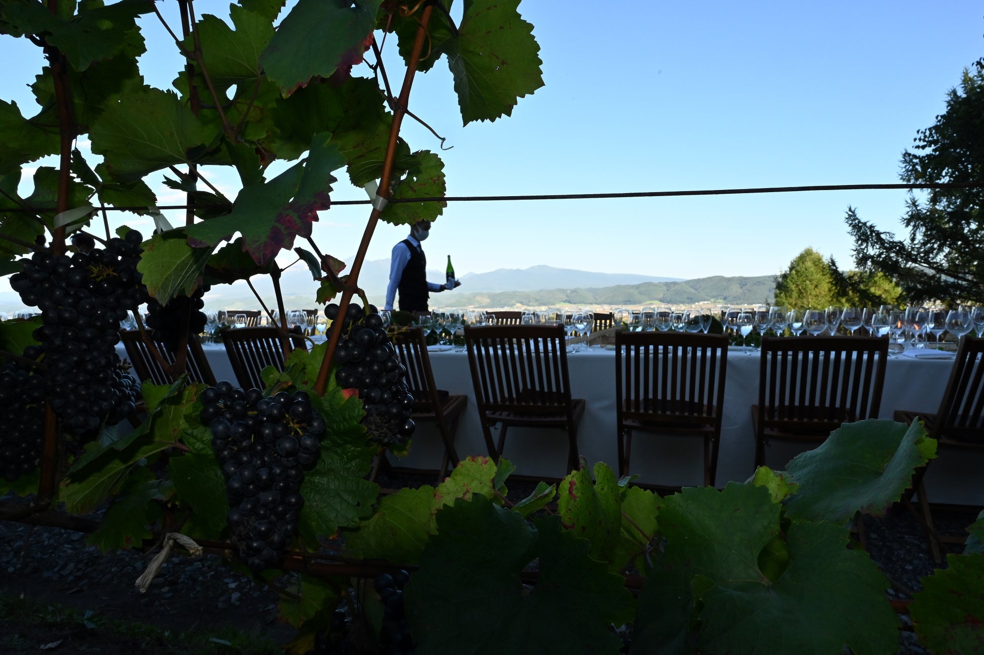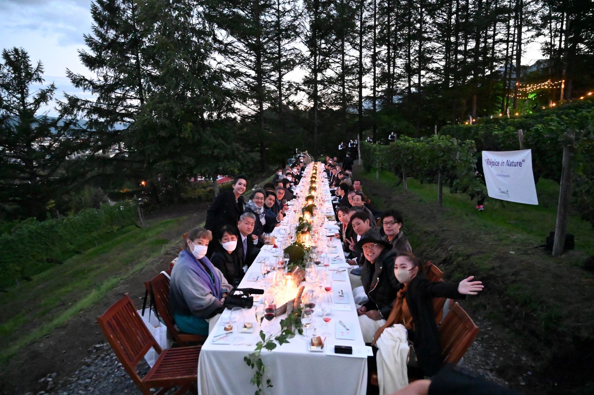 本スペシャルダイニングでは料理だけでなく、絶景絶景の中で一層華やかな雰囲気を醸成するピアノやコンテンポラリーダンス、富良野弥栄太鼓保存会による和太鼓のエンターテインメントを、食事の前には、富良野市が作るワイン畑でのブドウ収穫体験やオリジナルワインボトルづくりもお楽しみいただきます。