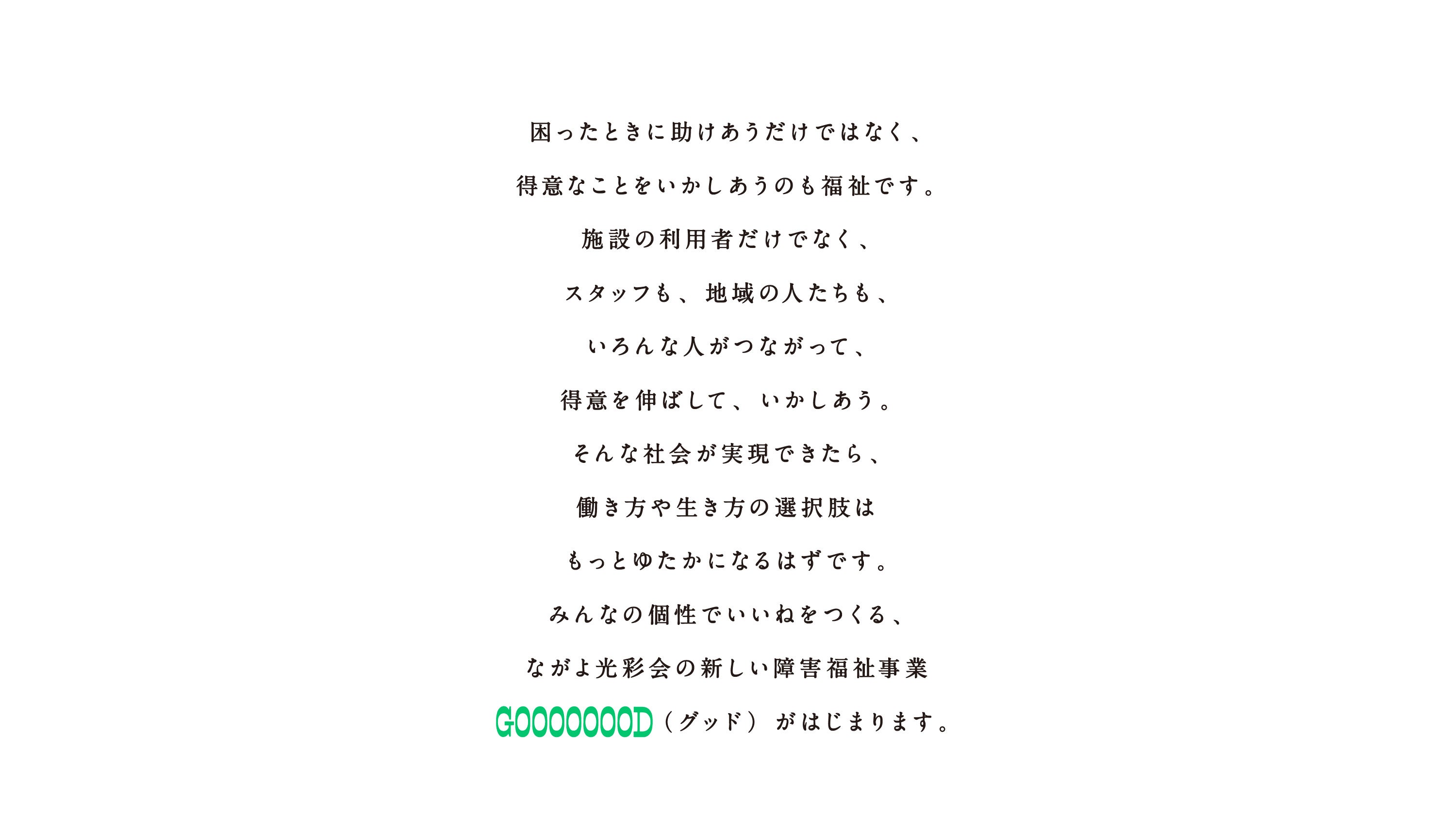 その知見を生かし、障害のある方々の働く選択肢を増やすために、就労継続支援B型事業所「GOOOOD KAGAYAKI(グッドカガヤキ)」を2023年4月1日からスタート。「得意を伸ばして、いかしあう。」をスローガンに、メンバーさんもスタッフも、自分の得意なことを生かして働くことができる環境をつくるために活動をしています。