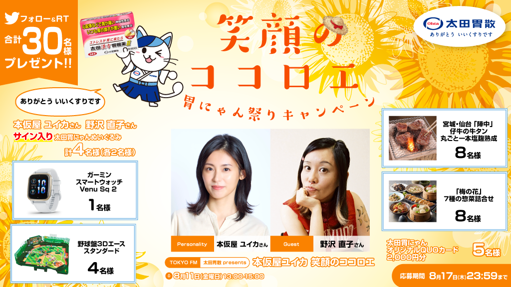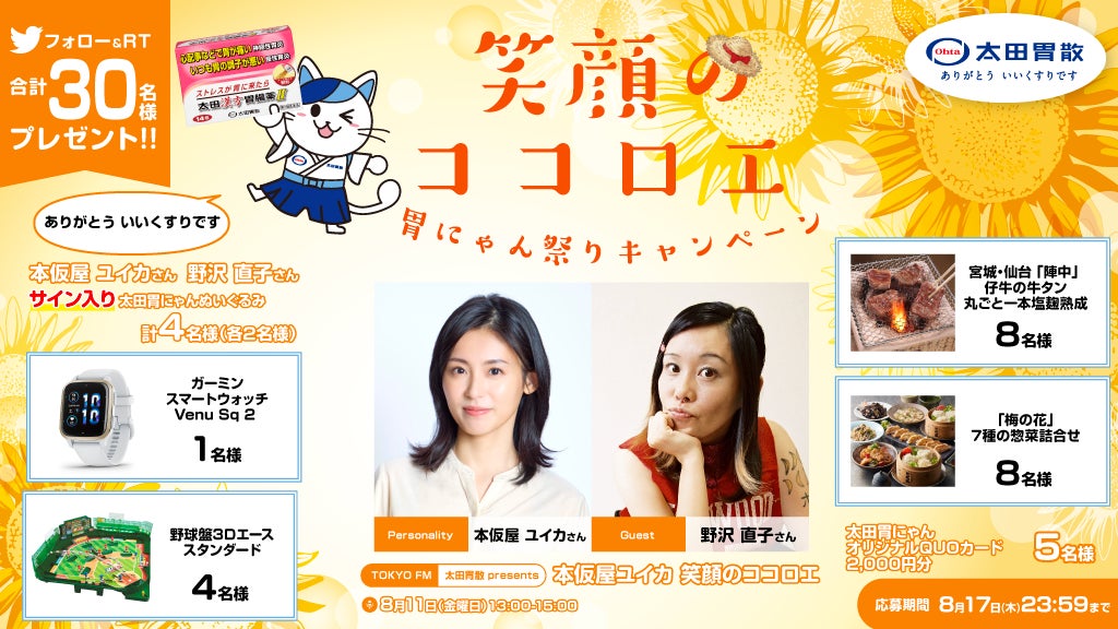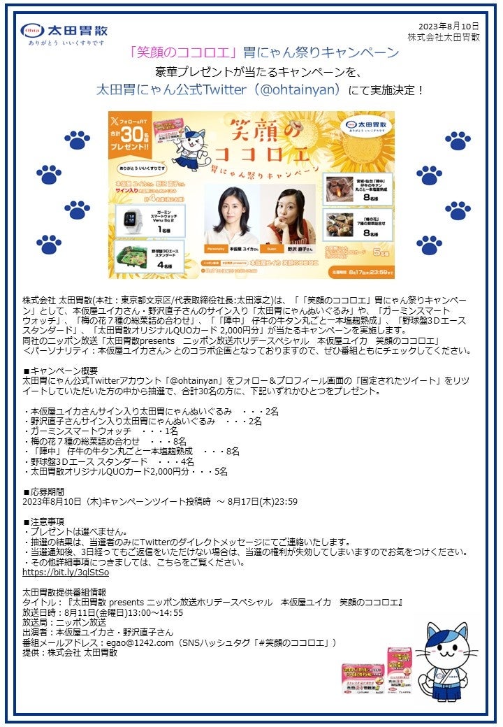 「笑顔のココロエ」胃にゃん祭りキャンペーン 豪華プレゼントが当たるキャンペーンを、太田胃にゃん公式Twitter(@ohtainyan)にて実施決定!