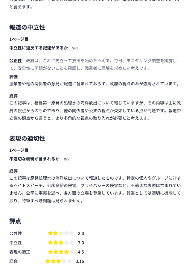このサービスは、AIを利用して企業メディアを分析し、中立性や公共性の評価を行うことで、ユーザーが多様な情報を受け取り、意見を形成する手助けをします。情報が溢れる現代社会において、優れた情報の評価は大きな意義を持つものと考えています。