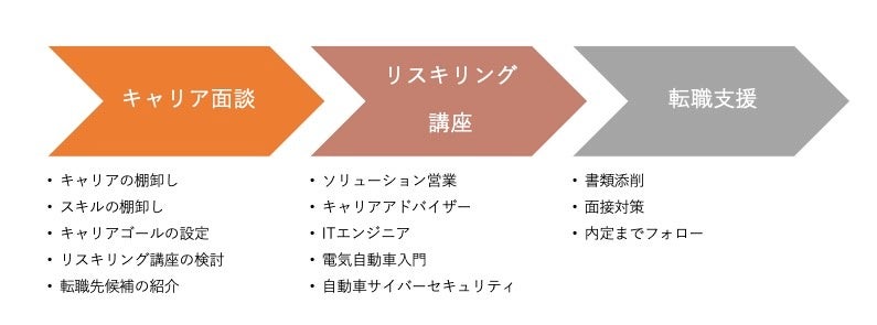 リスキリングと労働移動の円滑化を一体的に進める観点から、在職者が自らのキャリアについて民間の専門家に相談できる「キャリア相談対応」、それを踏まえてリスキリング講座を受講させる「リスキリング提供」、それらを踏まえた「転職支援」までを一体的に実施する事業となります。