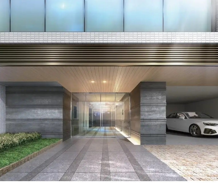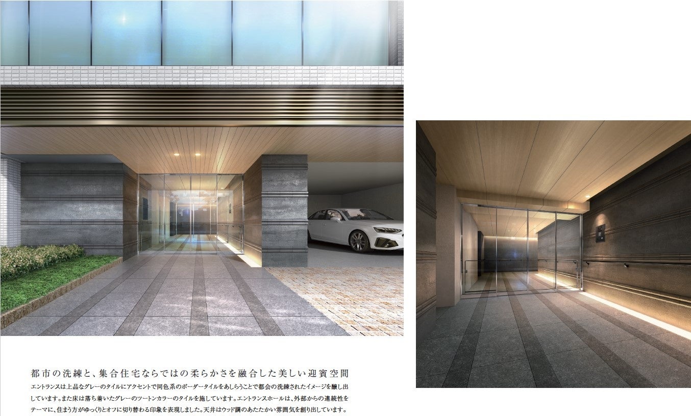 「東京を享受する、ゆとりある都心生活 」都市の洗練と、美しい迎賓空間エントランスは上品なグレーのタイルにアクセントで同色系のボーダータイルをあしらうことで都会の洗練されたイメージを醸し出しています。