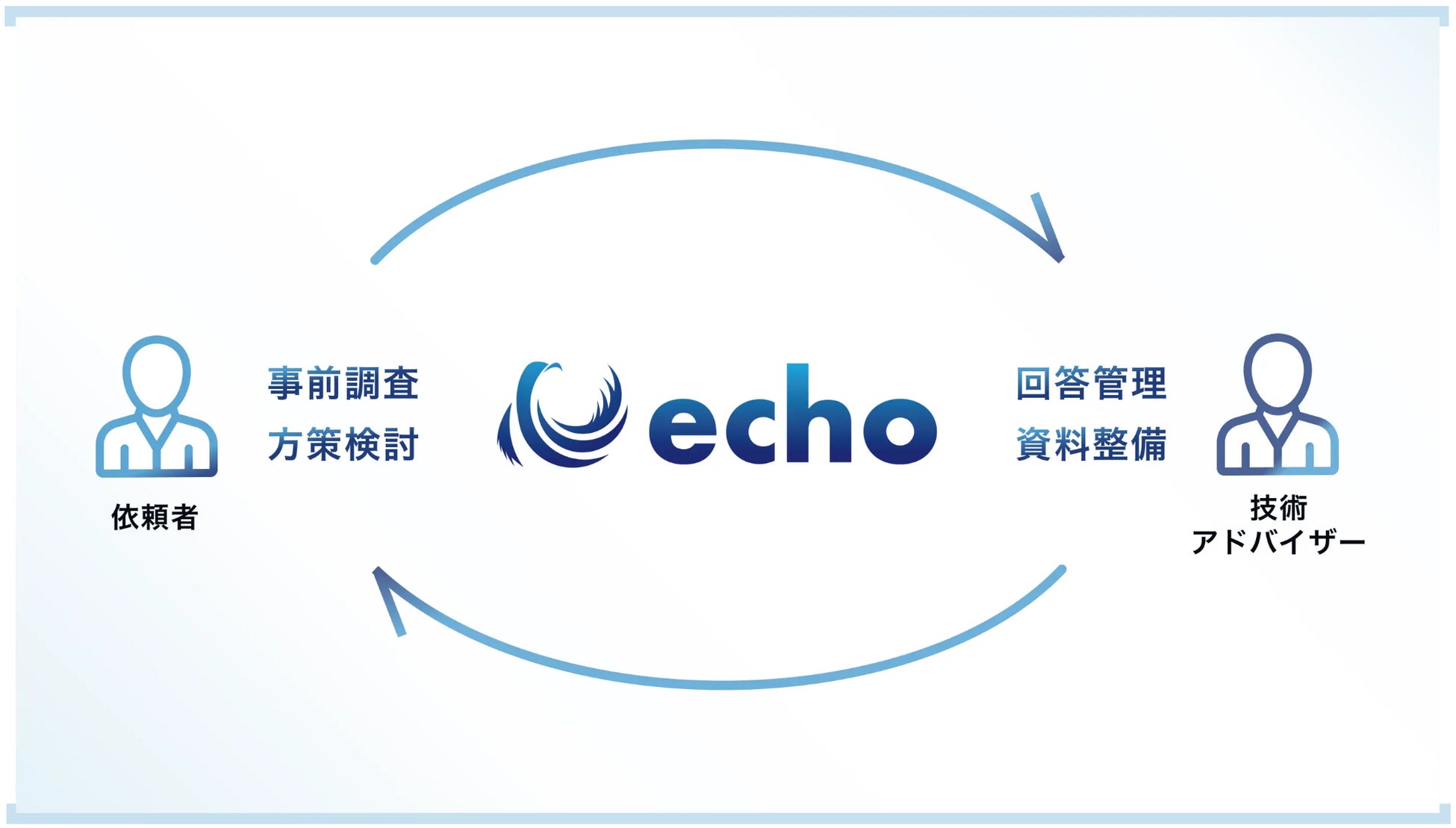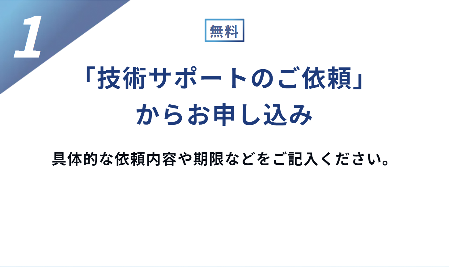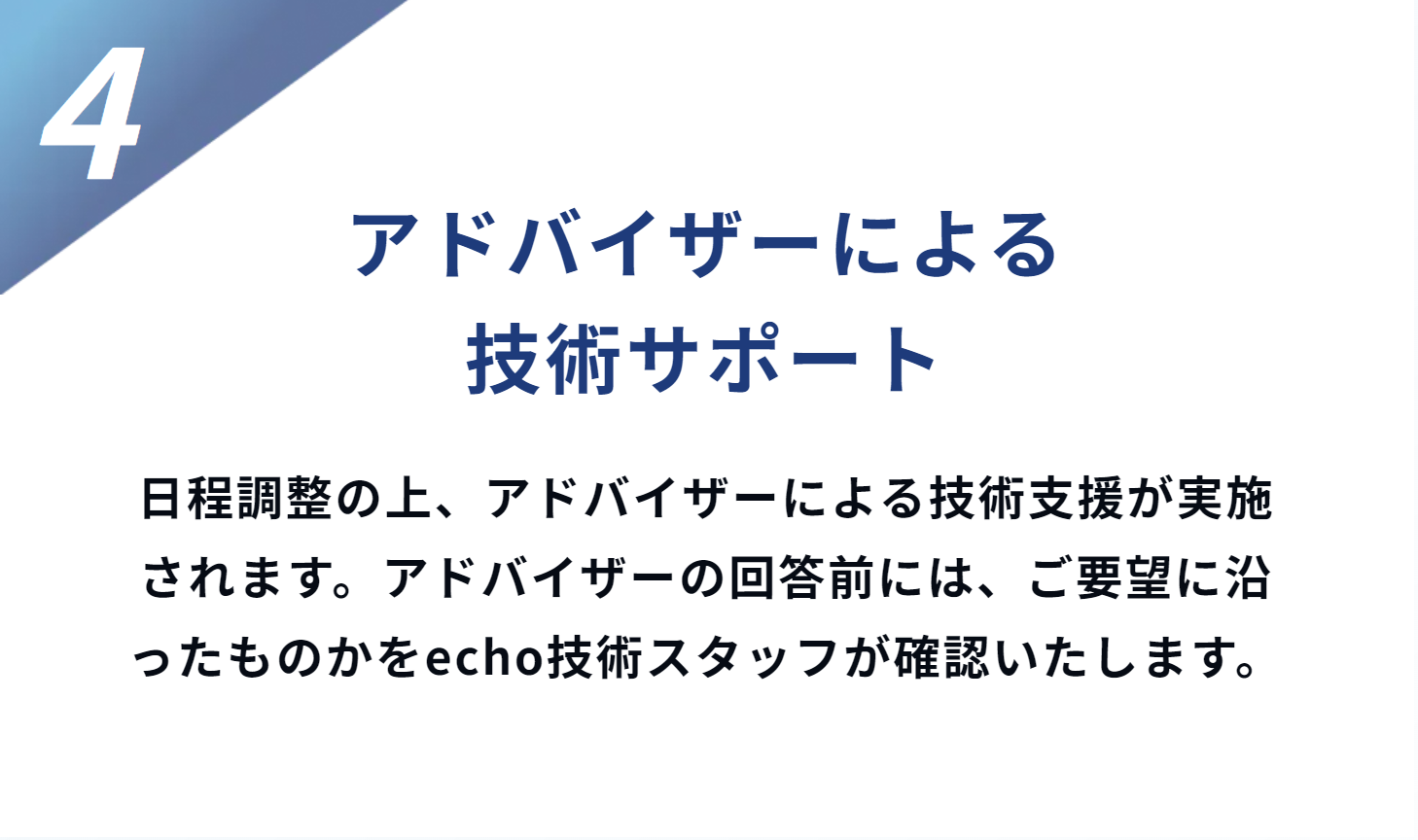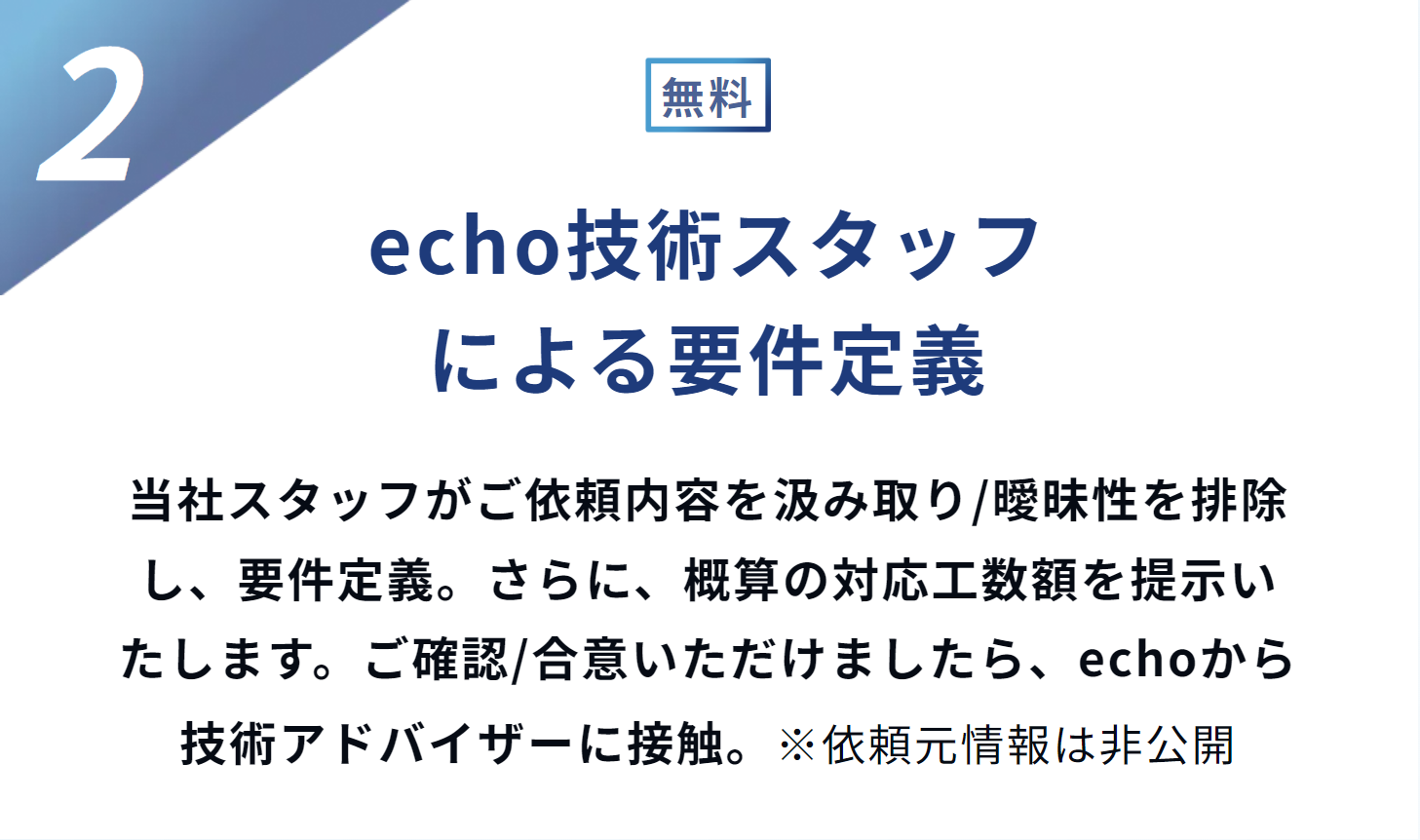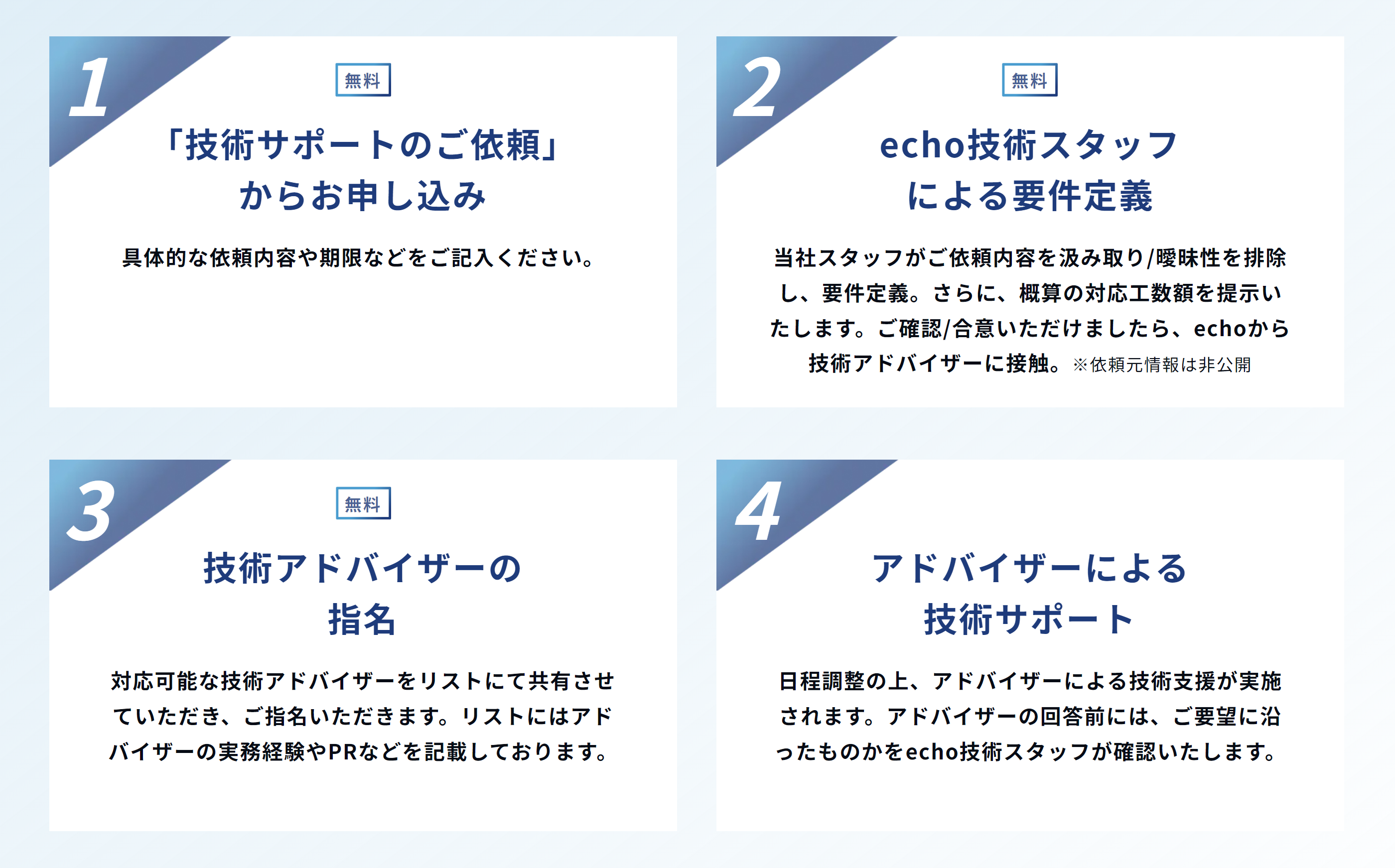 Webサイト専門フォーム(https://echo-ai.co.jp/request/)から技術サポートをご依頼いただいた後、当社スタッフによる要件定義を経て技術アドバイザーに接触し、対応可能な技術アドバイザーリストを共有いたします。その後、選出いただいたアドバイザーによる技術支援が実施されます。