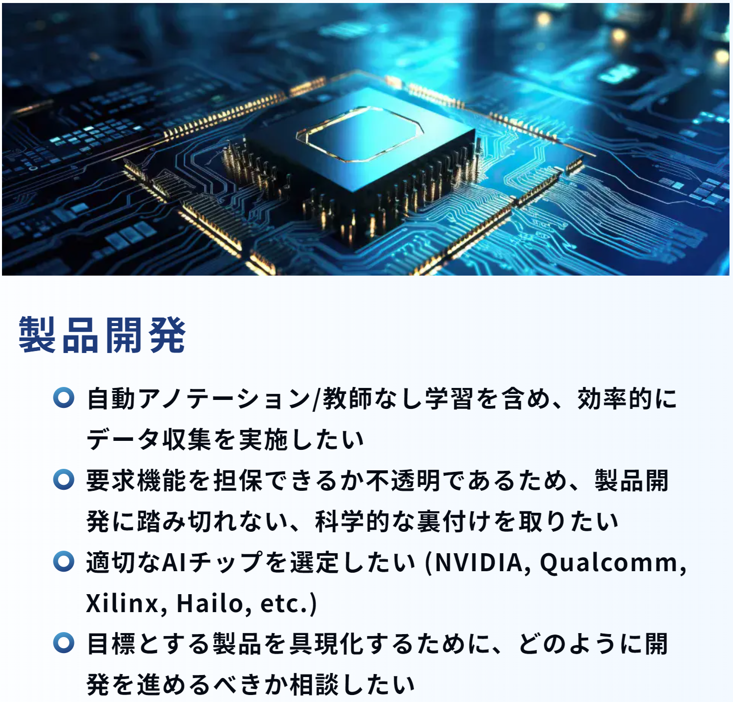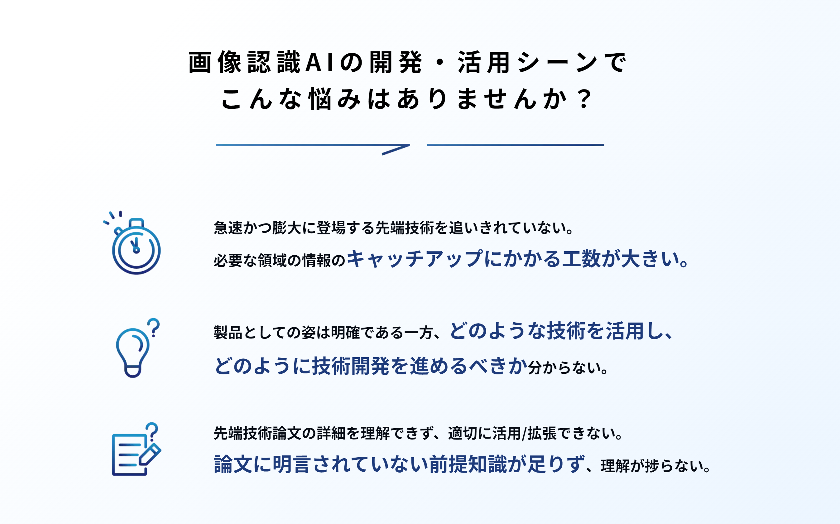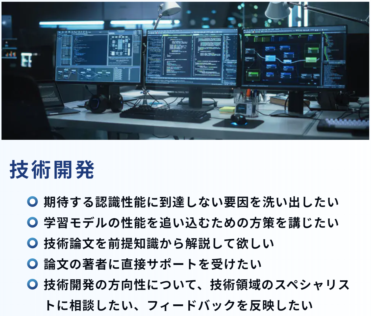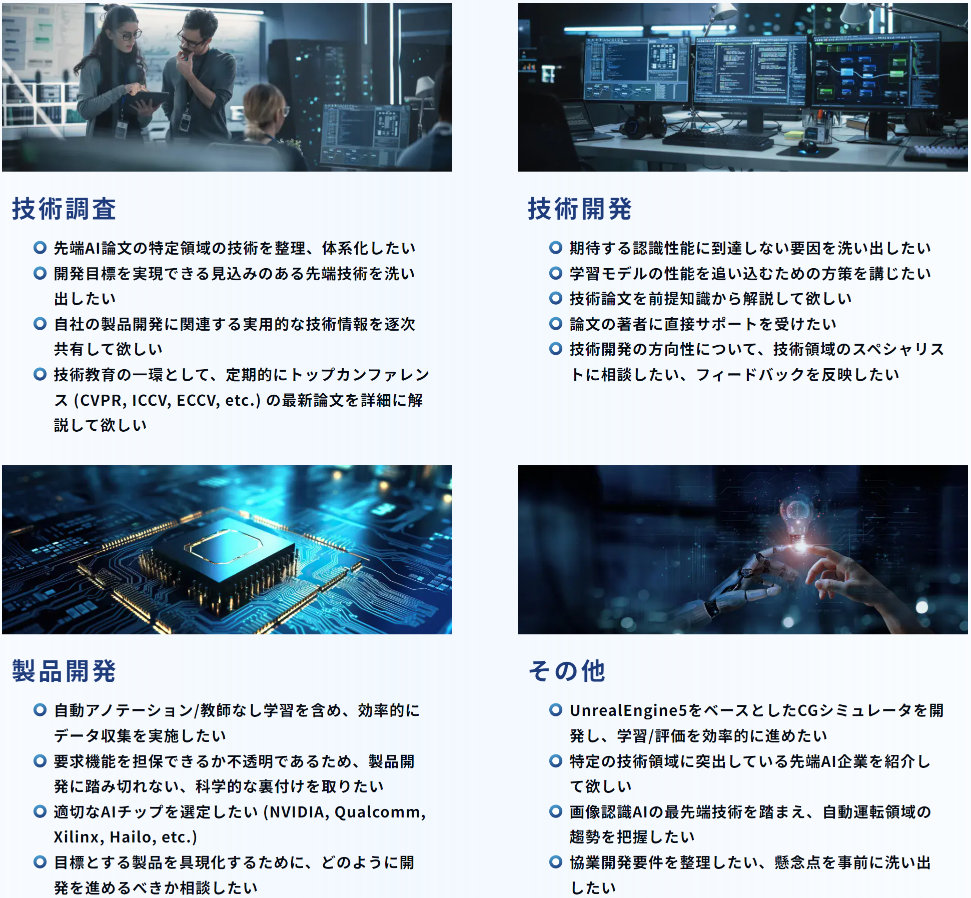 「技術と挑戦を結び、日本の未来を切り拓く」を使命に、画像認識AIに関する技術支援プラットフォームを運営するスタートアップです。論文解説から社会実装/運用まで、画像認識AIを用いた技術や製品の開発を強力に支援いたします。