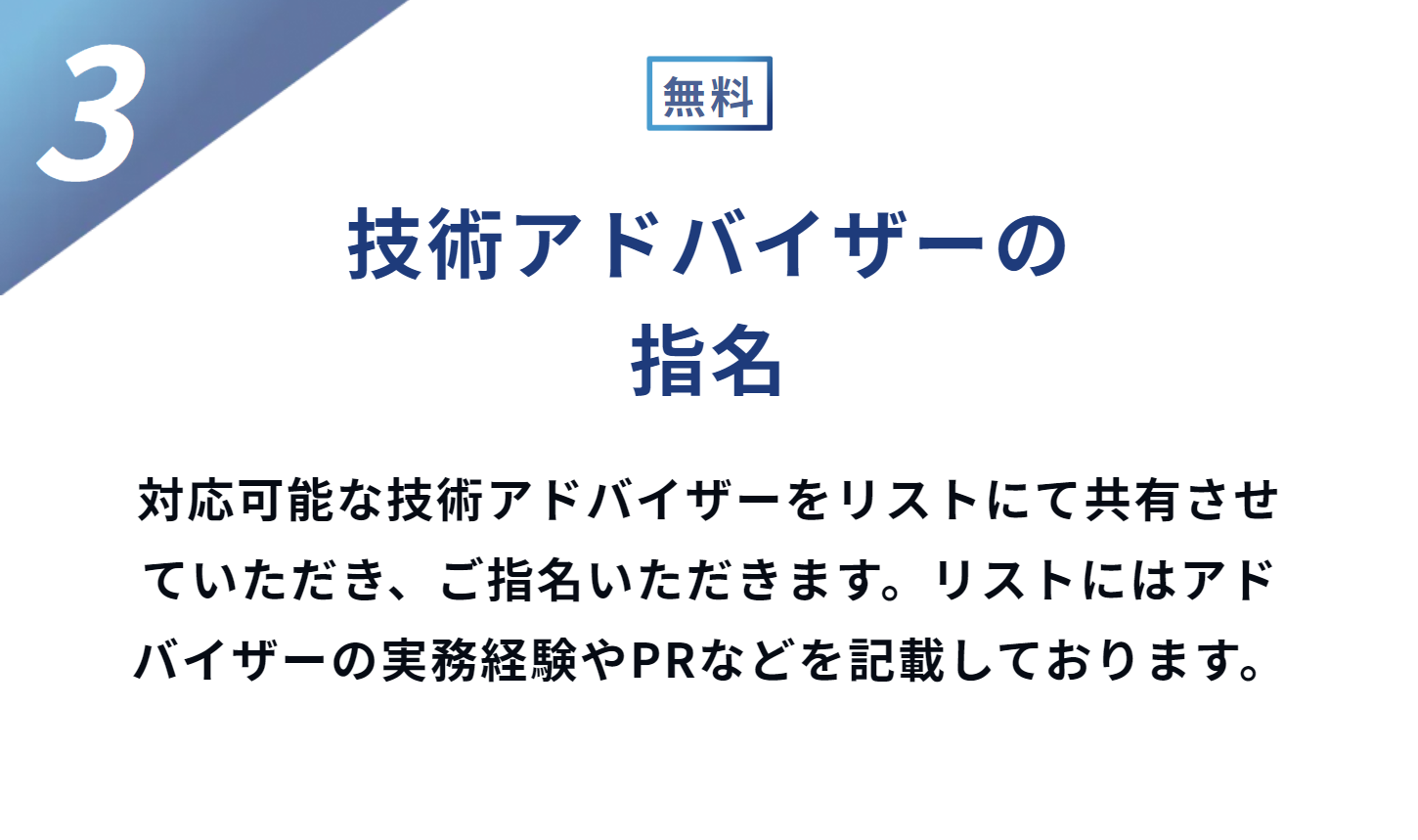 専門的な技術課題に対して、課題領域の専門性を持つアドバイザーがピンポイントに対応することで、開発コストの低減および技術・製品開発の効率化が叶います。