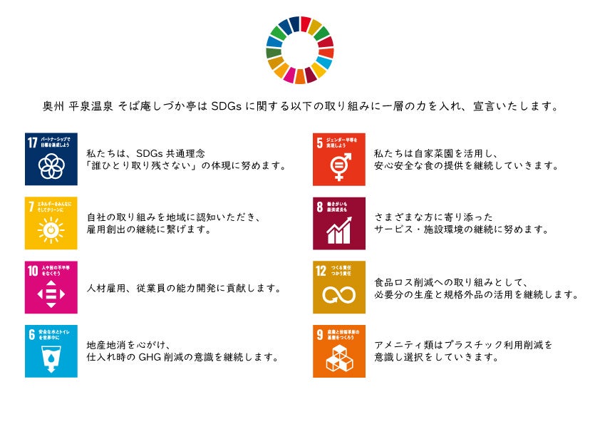 奥州平泉温泉 そば庵 しづか亭がSDGs宣言を公表 -ご宿泊・介護サービス利用の方へもわかりやすく社内意識共有へ-