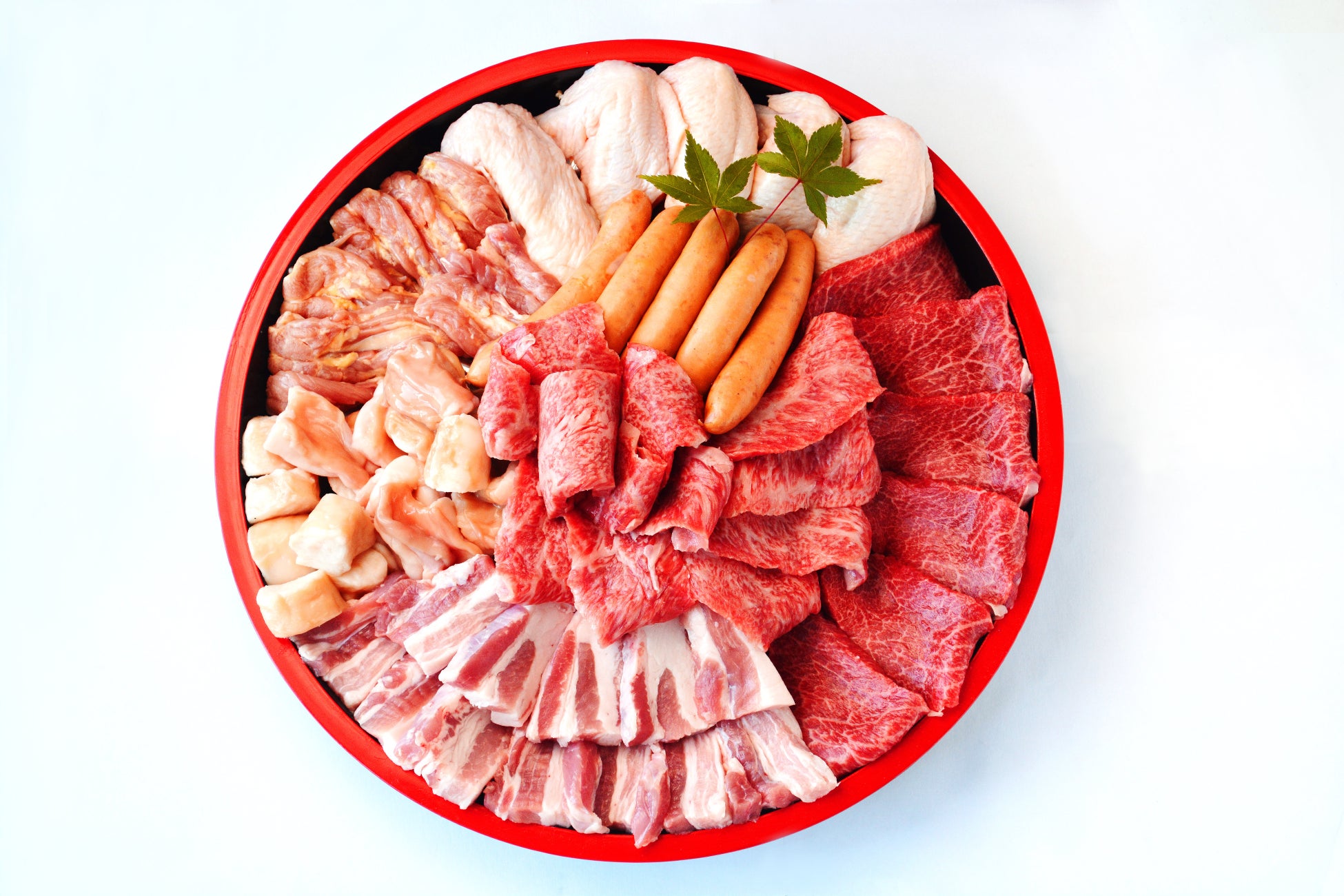 (盛り合わせ例:黒毛和牛肩モモ/黒毛和牛バラ/豚バラ焼肉用/牛ホルモン/手羽先/鶏セセリ/ウィンナー)