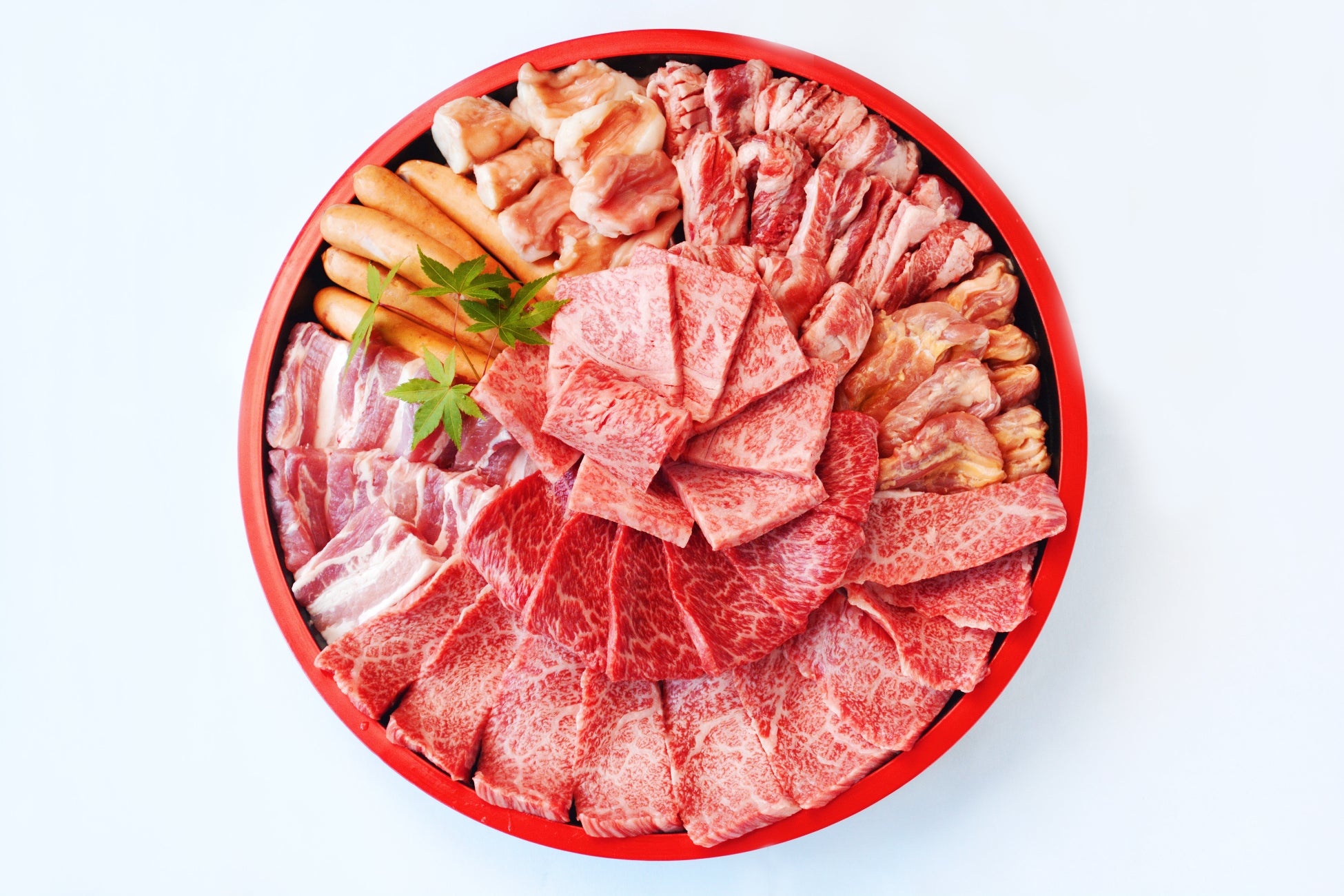 (盛り合わせ例:黒毛和牛肩ロース焼肉用/黒毛和牛サガリ焼肉用/イベリコ豚中落ちカルビ/牛丸腸/鶏セセリ/ウィンナー)