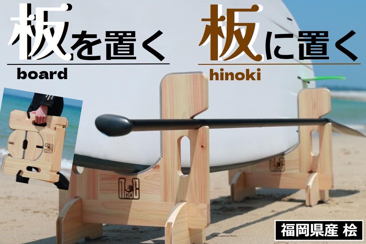 【新商品】パドルも一緒に! 福岡県産ヒノキの間伐材で作ったSUP及びサーフボード用のポータブルラック 使わない時は板状になる独自のデザイン