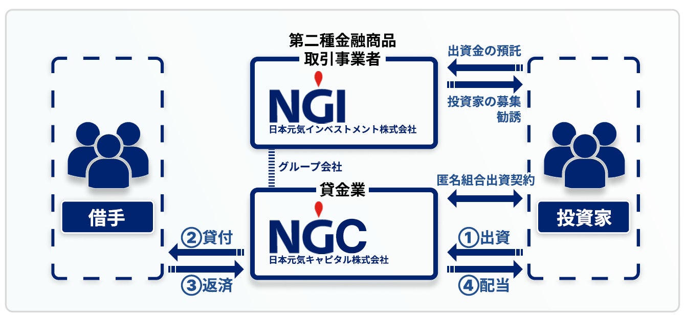 当社が運営する融資型クラウドファンディング(ソーシャルレンディング)は当社の100%親会社となる元気フィンテックソリューション社の100%子会社となるNGCが実際の貸付業務を行います。当社はNGCから投資家の募集の依頼を受けることとなります。 投資家は当社に投資家登録の申請や、出資の申込を行うものの、実際に出資契約(匿名組合出資契約)を締結するのはNGCとなります。投資家が締結する契約は、NGCが実施する貸金業へ匿名組合出資を行う契約となります。