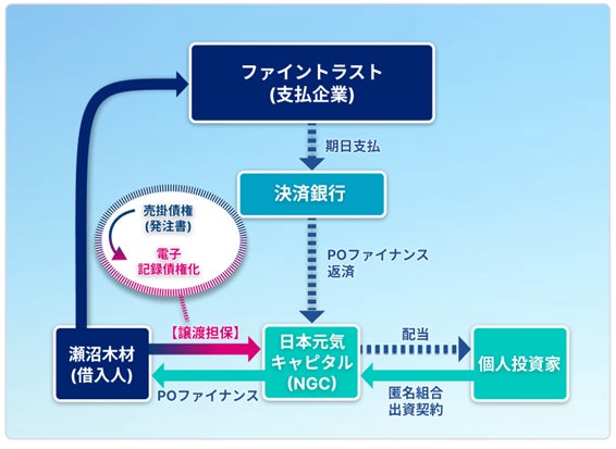 ・募集内容:匿名組合出資における営業者である日本元気キャピタル社(本社:神奈川県横浜市港北区新横浜、代表取締役:兼松誠司、貸金業登録番号:神奈川県知事(2)第05049号、以下「NGC」)が瀬沼木材社がファイントラスト社より受注しているマンション建設工事の発注書を担保に1,000万円を融資する事業へ出資するファンドとなります。資金使途は瀬沼木材社の運転資金となります。発注書はトランザックス社の「POファイナンス®︎(POファイナンス®︎はTranzax株式会社の商標登録されたサービスです)」のシステムを活用し電子記録債権化されます。