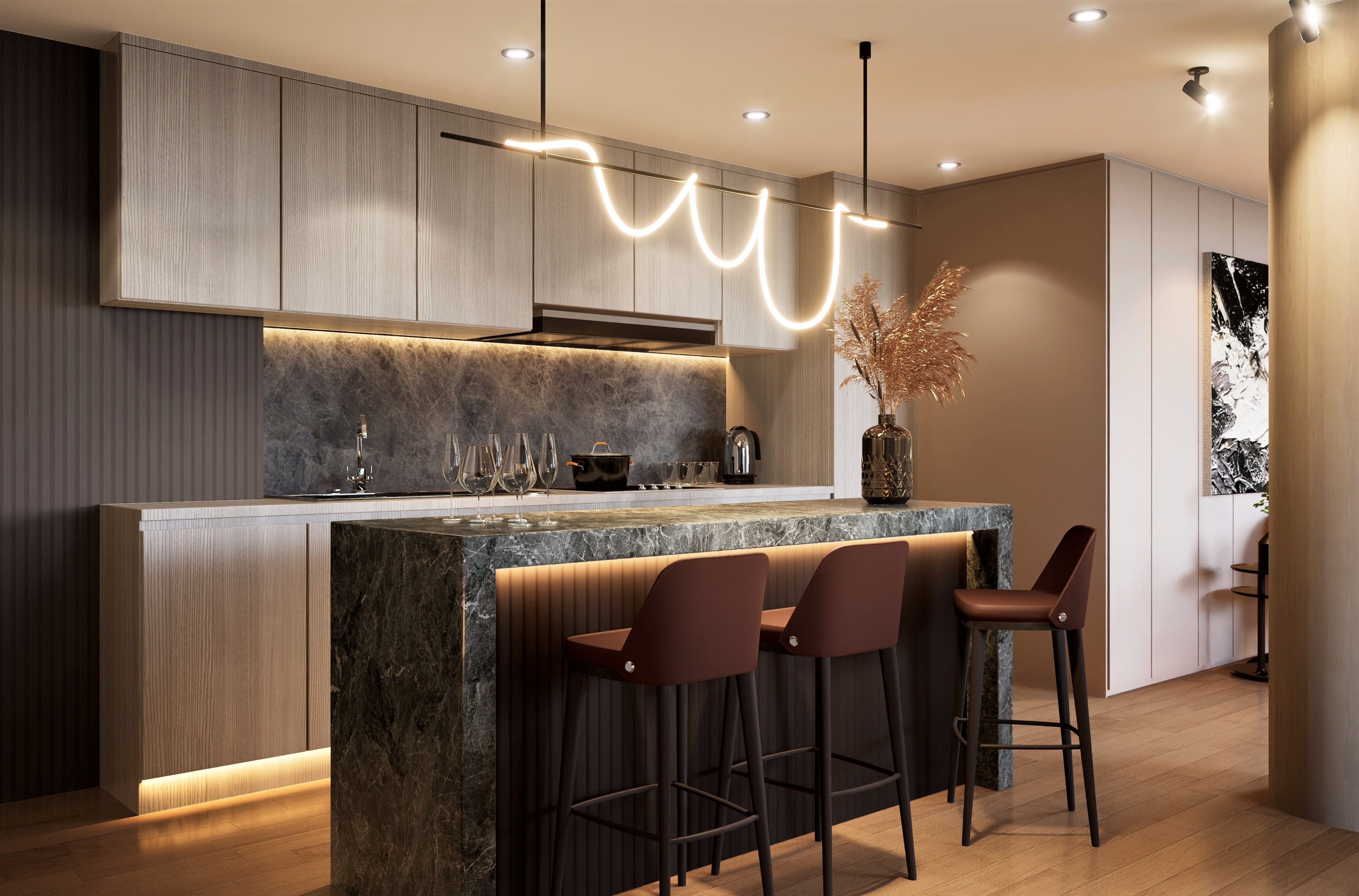 各住宅には家具が完備され、プロフェッショナルな内装が施されています。考え抜かれたインテリアデザイン、モダンで快適な家具、印象的なアート作品、至る所に見受けられる個性的なディテールが、特別感と居心地の良さを同時に感じさせてくれます。また、それぞれの部屋には各オーナーの所有物を収納できるスペースを備えていますので、ドアを開けた瞬間からご自宅のようにお寛ぎいただけます。
