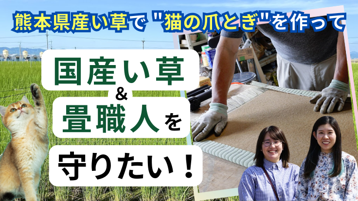 畳職人と「熊本県産い草で作る 猫の爪とぎ用ミニ畳」を開発、国産い草を守るためクラウドファンディングに挑戦!
