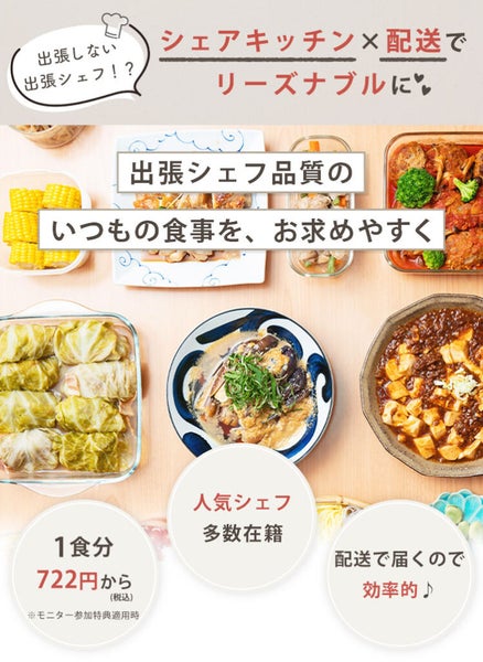 出張シェフや料理代行等で活躍するプロのシェフが、3日分程度の”いつもの食事”の作り置きを当社サイトに出品。利用者はサイトに掲載されている豊富なシェフや料理から気に入った出品を選び、オンラインで決済するだけで、シェフが作った高品質な食事がお家に届きます。弊社はキッチンや配送等のインフラを提供することで、料理の販売高に応じた手数料収入を頂戴します。