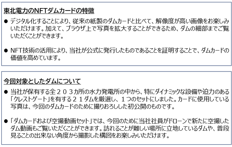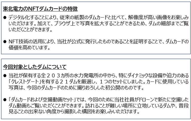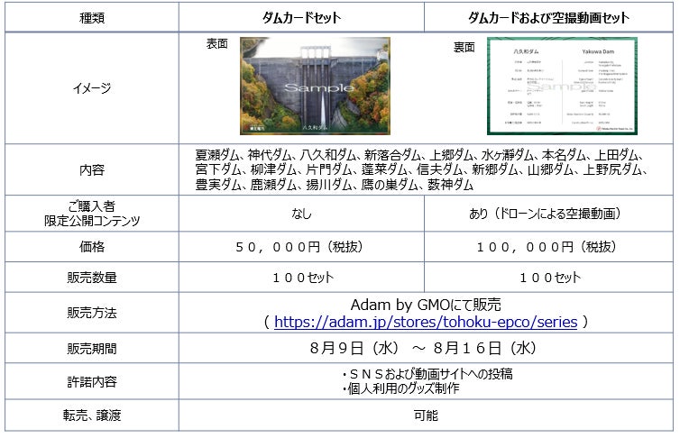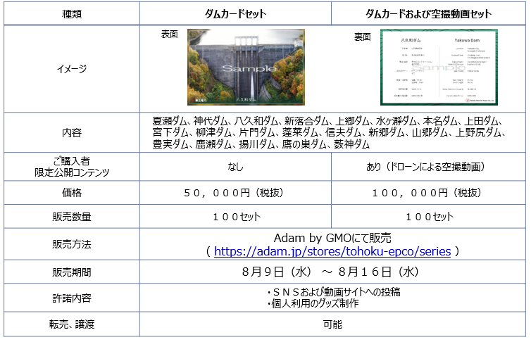 販売はGMOインターネットグループが展開するNFTプラットフォーム『Adam byGMO』(https://adam.jp/stores/tohoku-epco/series)で行い、ダムカードセットおよび動画セットを各100セット限定で販売いたします。