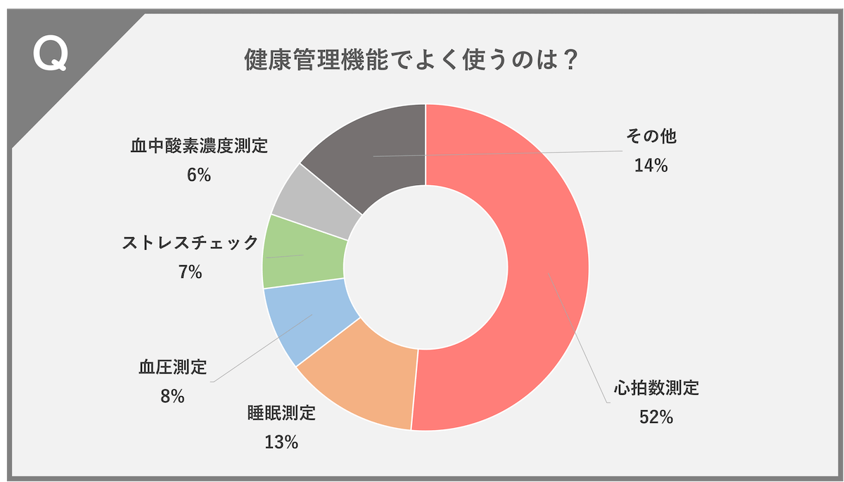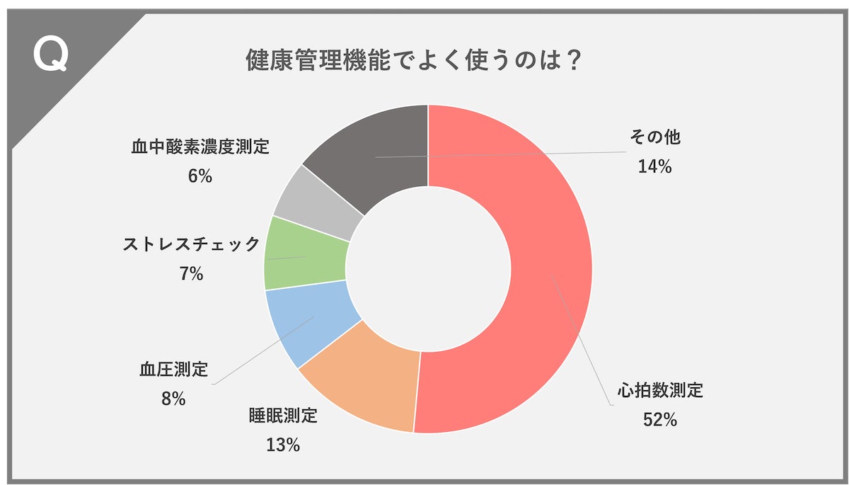 心拍数測定(52%)、睡眠測定(13%)、血圧測定(8%)、ストレスチェック(7%)、血中酸素濃度測定(6%)、その他(14%)という結果になりました。