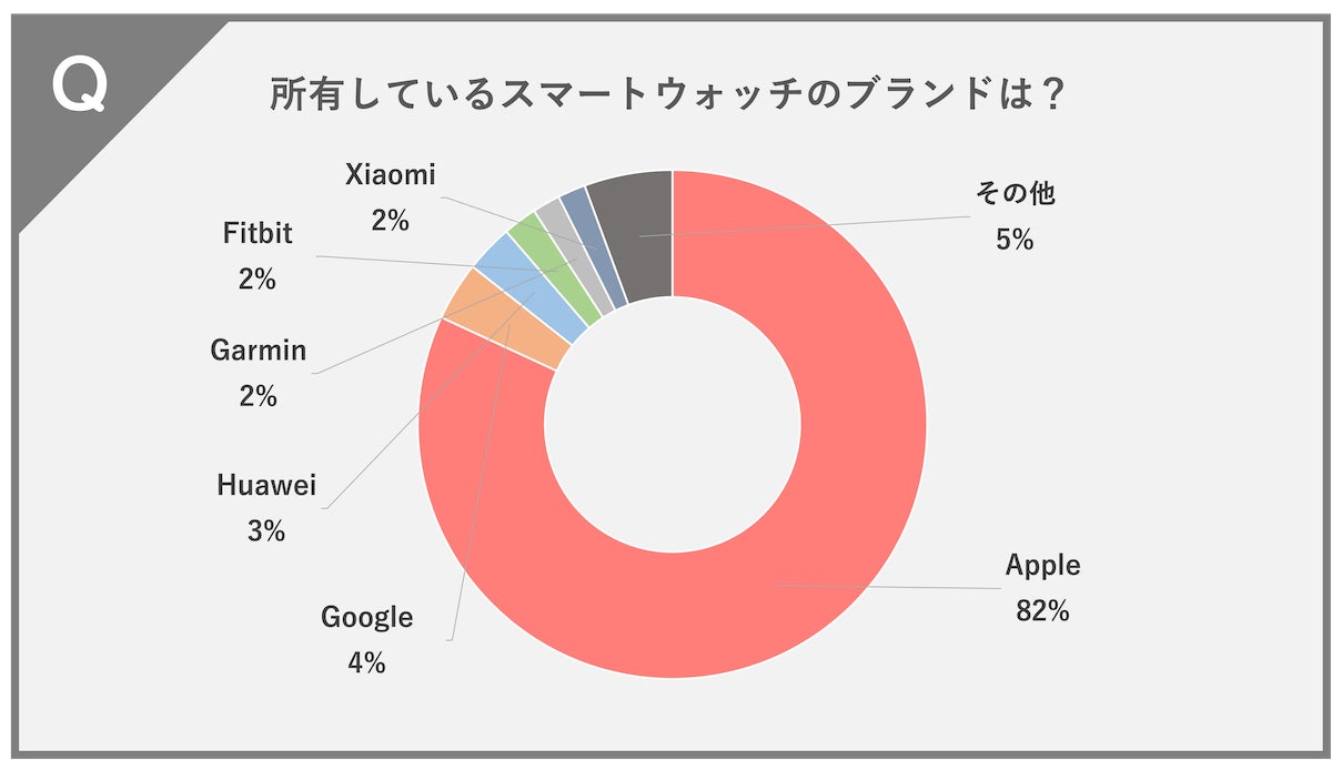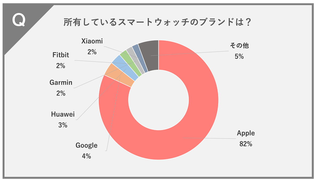 Apple(82%)、Google(4%)、Huawei(3%)、Garmin(2%)、Fitbit(2%)、Xiaomi(2%)、その他(5%)という結果になりました。