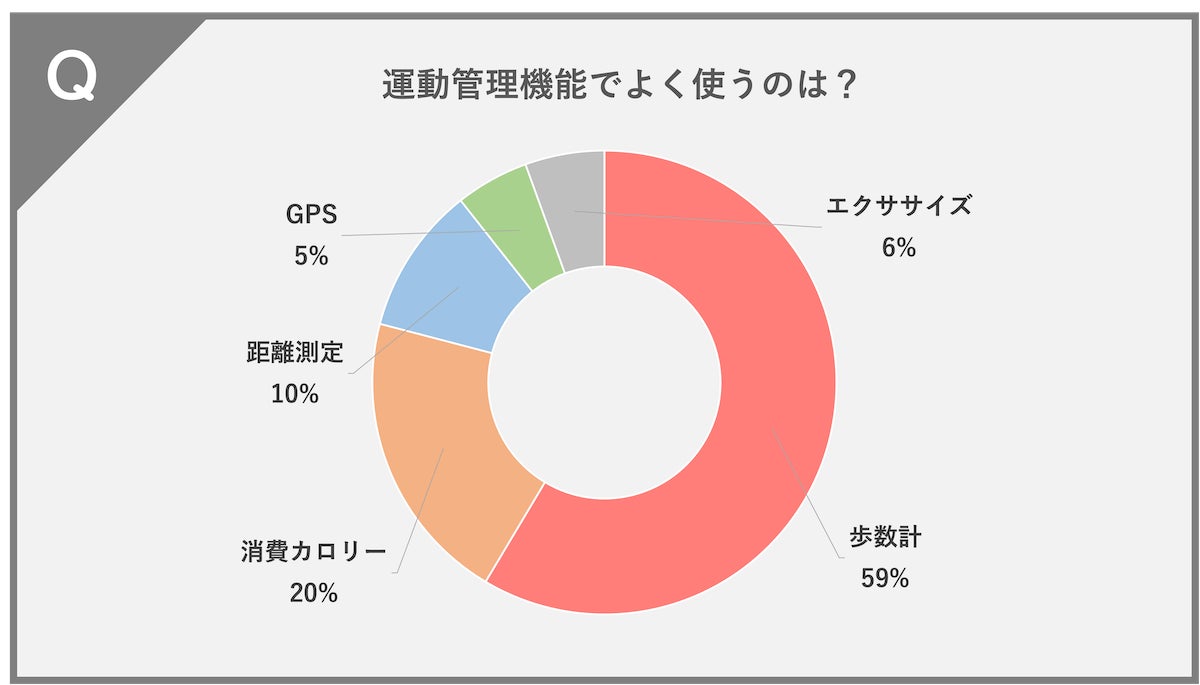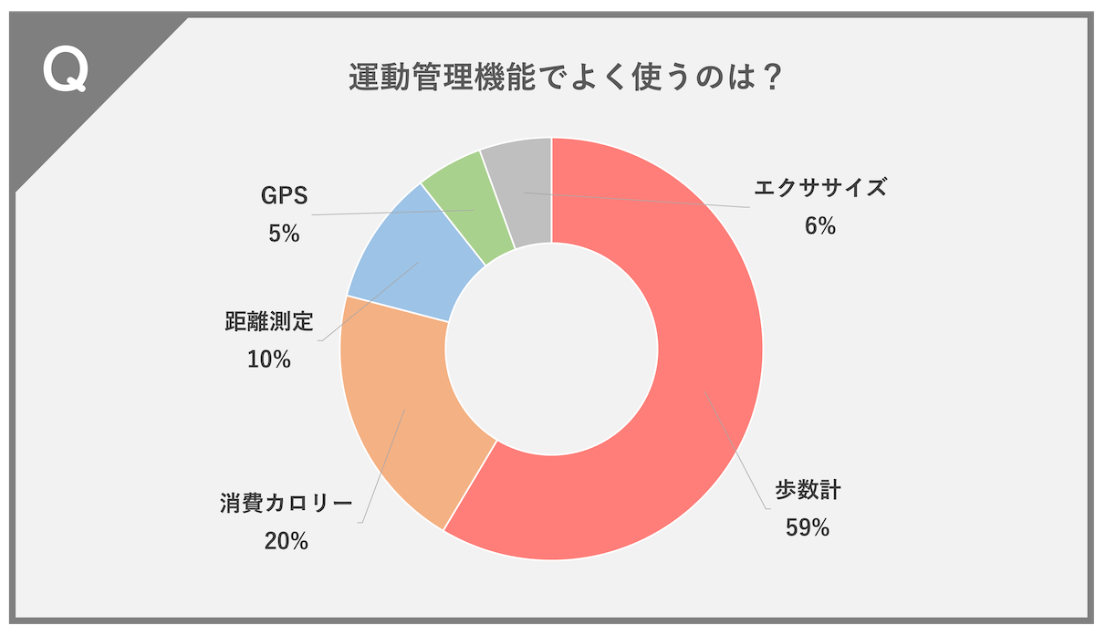 歩数計(59%)、消費カロリー(20%)、距離測定(10%)、エクササイズ(5%)、GPS(6%)という結果になりました。