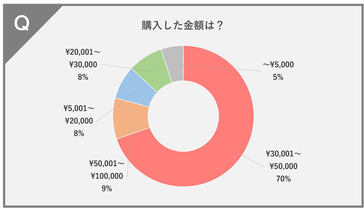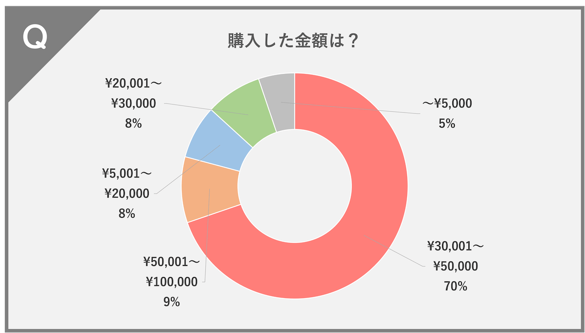 ¥30,001〜¥50,000(70%)、¥50,001〜100,000(9%)、¥5,001〜¥20,000(8%)、¥20,001〜¥30,000(8%)、〜¥5,000(5%)という結果になりました。