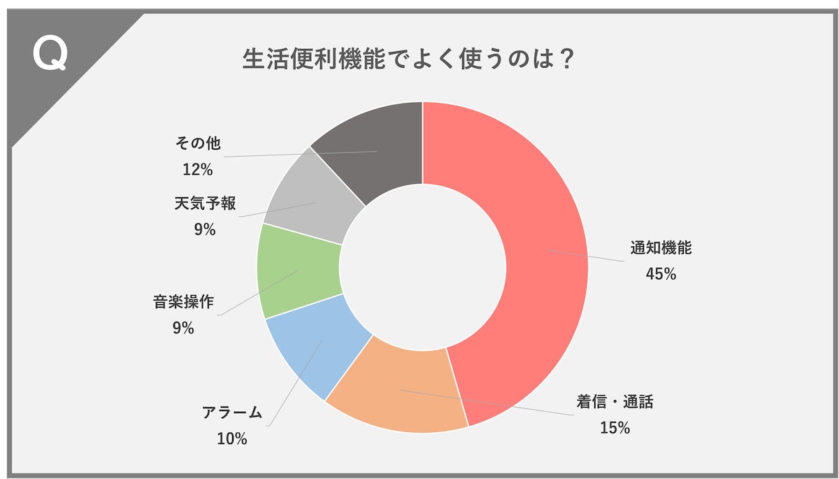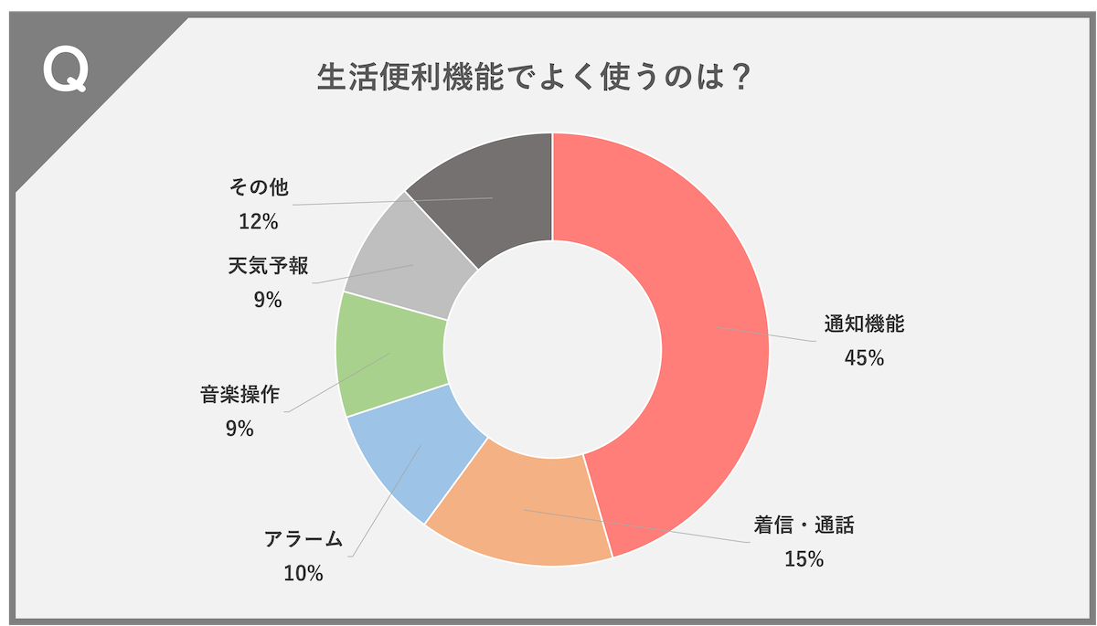 通知機能(45%)、着信・通話(15%)、アラーム(10%)、音楽操作(9%)、天気予報(9%)、その他(12%)という結果になりました。
