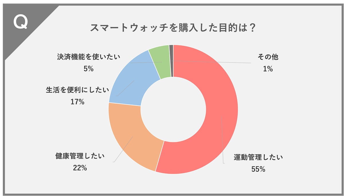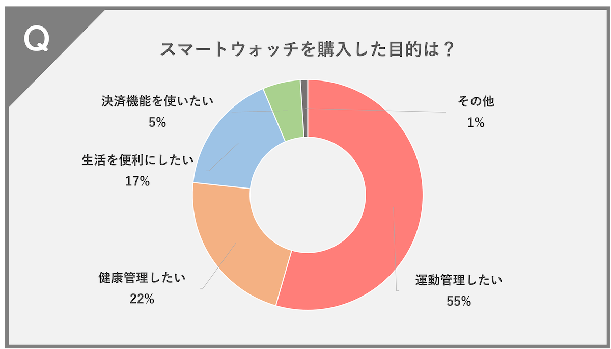 運動管理したい(55%)、健康管理したい(22%)、生活を便利にしたい(17%)、決済機能を使いたい(5%)、その他(1%)という結果になりました。