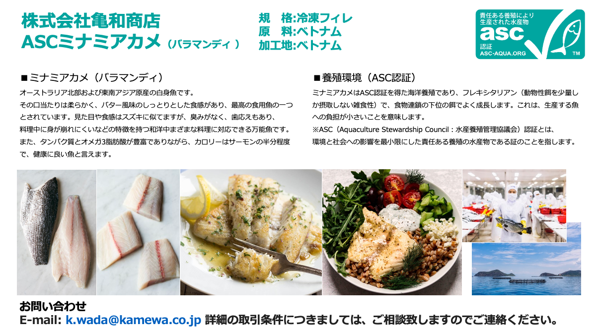 株式会社亀和商店(所在地:東京都江東区豊洲六丁目6番1号、代表:和田一彦)は、ASC認証を得たオーストラリア北部および東南アジア原産の白身魚「ミナミアカメ」の取り扱いをさらに拡大しました。