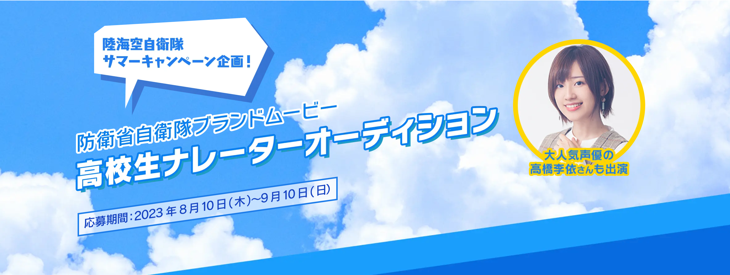 防衛省は、防衛省自衛官ブランドムービーの制作にあたり、高校生を対象とした未来の声優を志している『高校生ナレーターオーディション』を開催。現在放映中のブランドムービーでは、アニメ「【推しの子】」で主要キャストのひとり・アイ役を演じて話題沸騰中の高橋李依さんがナレーターを務めています。今回のオーディションで選ばれた高校生には、ブランドムービーのナレーターを務めていただきます。