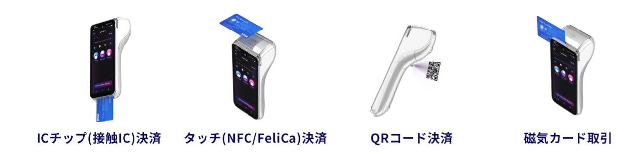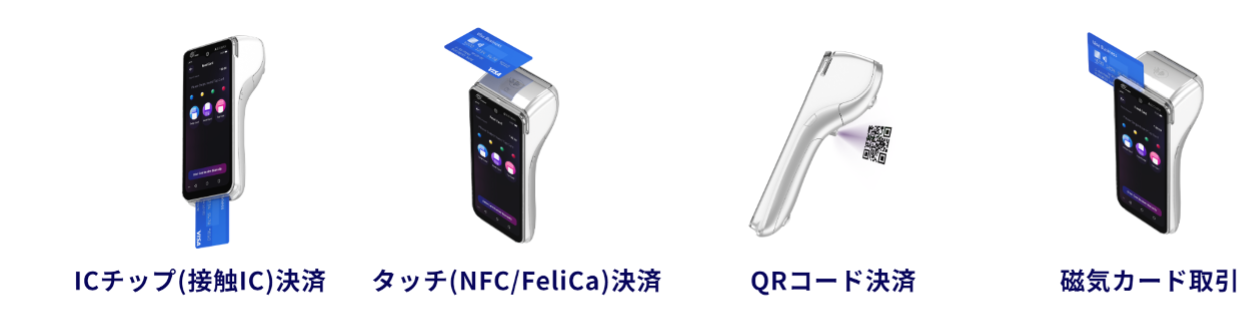 ICチップ(接触IC)、タッチ決済(NFC/FeliCa)、QRコード決済、磁気カード取引に対応。