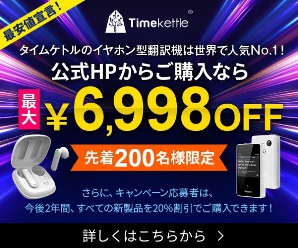 株式会社ニュータイムズテック(本社:東京都港区)は、イヤホン型翻訳機のトップブランド『タイムケトル』の独占販売開始を記念し、公式HPでの購入で最大6,998円の割引になるキャンペーンを開催いたします。