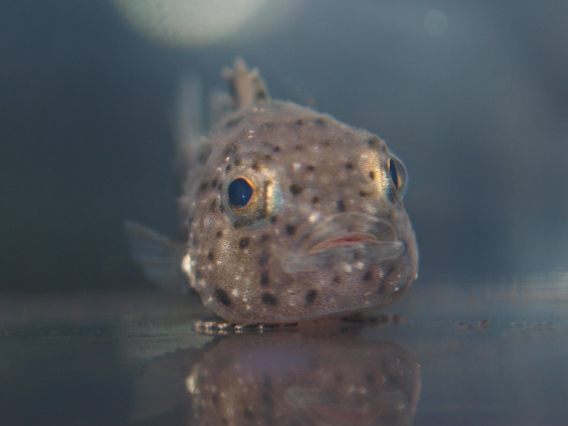 体には三角形のこぶ状突起が多数あり、お菓子の金平糖に似ていることから、この名前がつけられました。左右の腹ビレは一体化して吸盤状になり、壁に付着することができます。