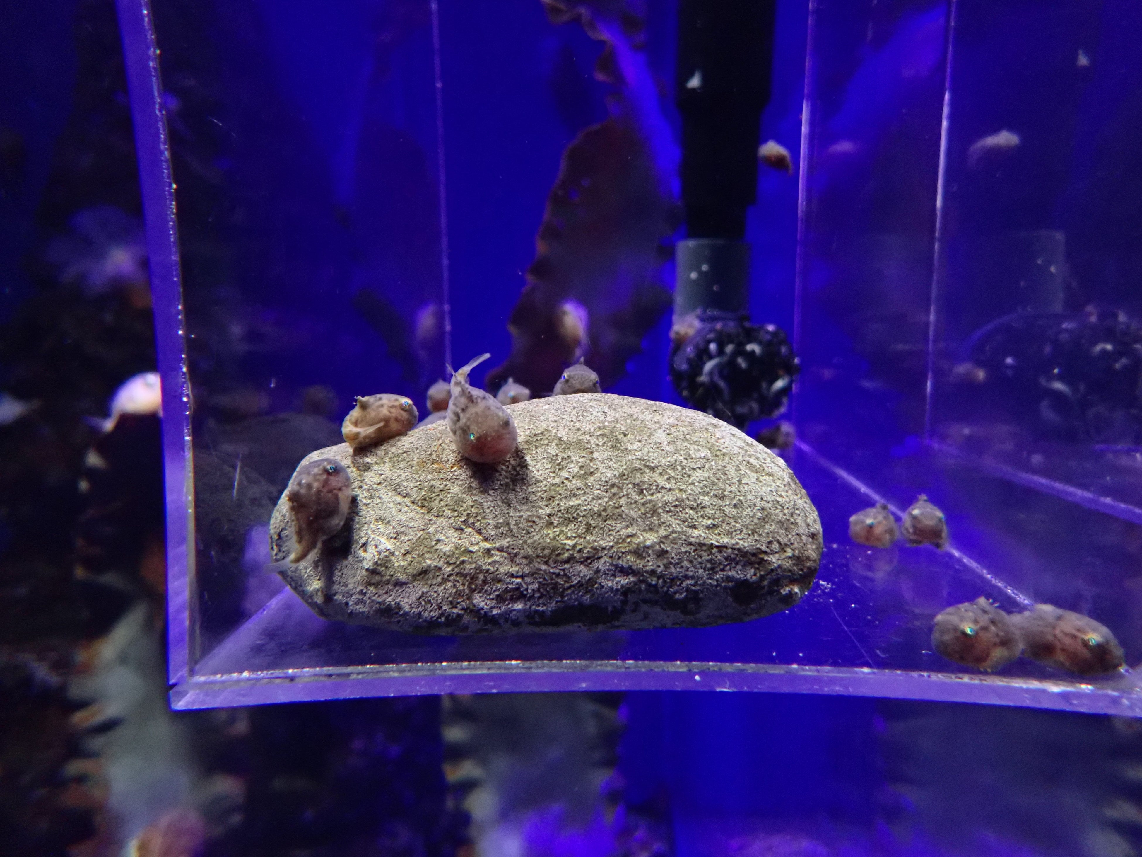 当委員会では2022年より水族館の展示種の中で大変人気のあるダンゴウオ科魚類の代表種としてコンペイトウの繁殖に取り組み、2008年に本種の繁殖に初めて成功した越前松島水族館を中心に研究を進めて参りました。その結果2023年1月に新江ノ島水族館、続いて2月に越前松島水族館で孵化に至り、その稚魚・幼魚を両館併せて700尾以上育成しております(2023年8月現在)。