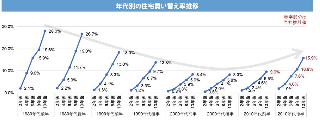 1980年代は、住宅の劣化を起点として住み替えが比較的多く発生したものの、その後は住宅性能の向上/住宅価値の安定に伴い、2000年代までは住み替えが減少していく状況が続いていた。