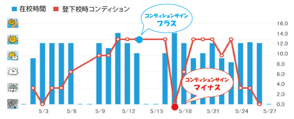 コンディションを毎日記録し、可視化することにより、子どもたちの心の様子が一目でわかります。子どもたち自身にも、自分の心と向き合う習慣を通して、自分をより深く知ることが出来ます。
