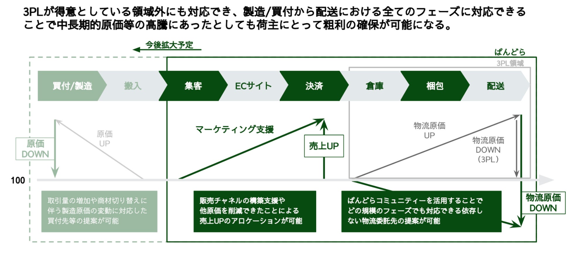 →販路の拡大をぱんどらが支援することで、倉庫で受託する案件の総量が増える