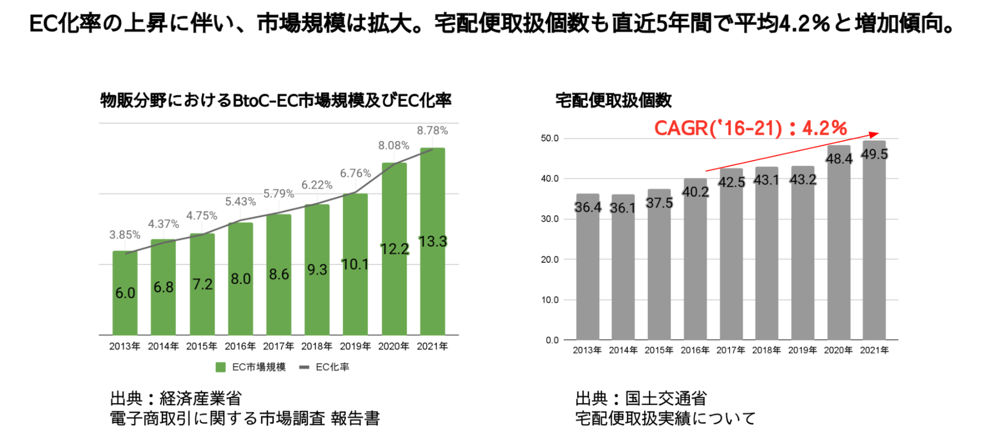 物販分野におけるEC市場は年々増加傾向にあります。それに比例し宅配便取扱個数も増加、さらに配達方法や物販の種類の多様化が進んでいます。