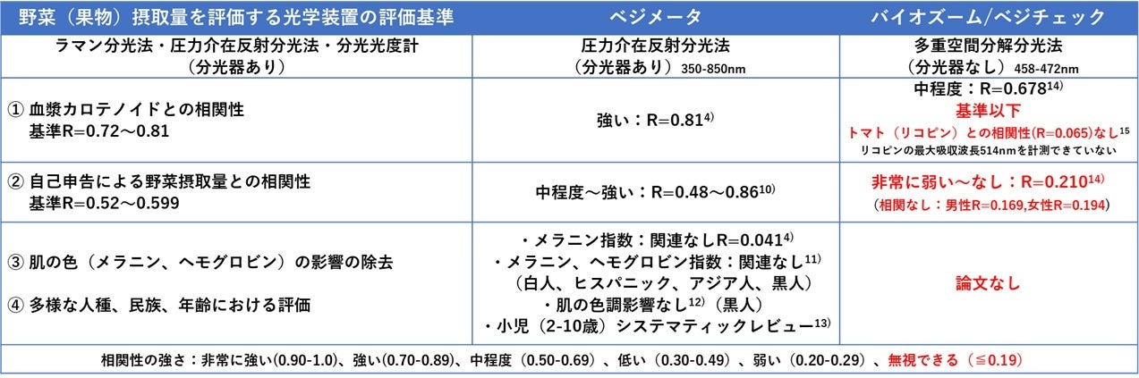 また、ヘモグロビンの影響やメラニン色素量が比較的多い日本人を含むアジア人に関する報告はされておらず、肌の色(メラニン色素)の影響を強く受ける小児測定の科学的妥当性評価の論文がなく、バイオズーム装置/べジチェックは、野菜(果物)摂取量を評価する光学装置の評価基準を満たしておりません。(2023年8月現在)