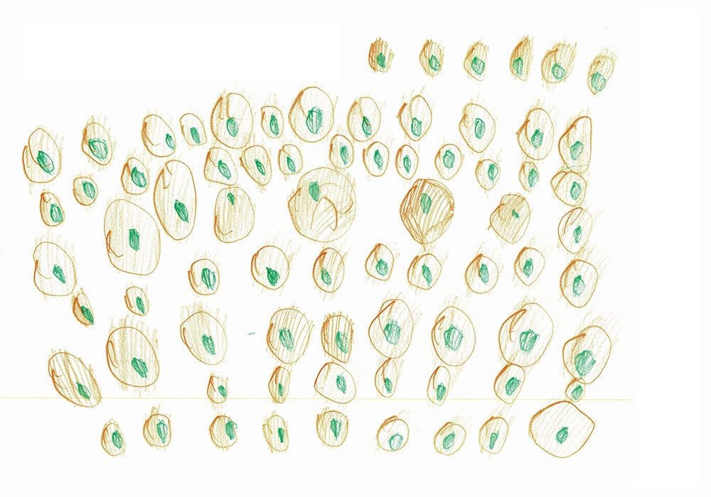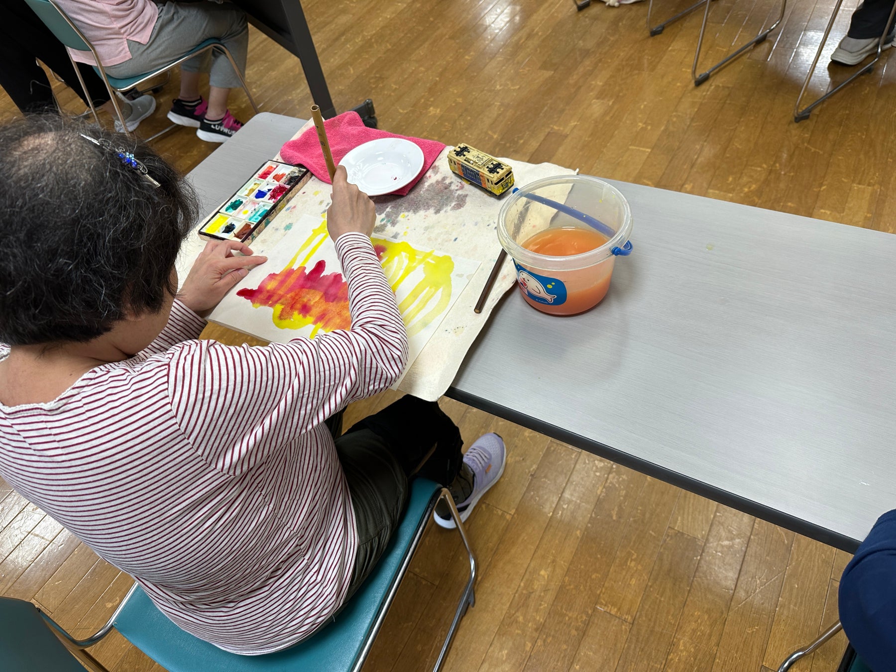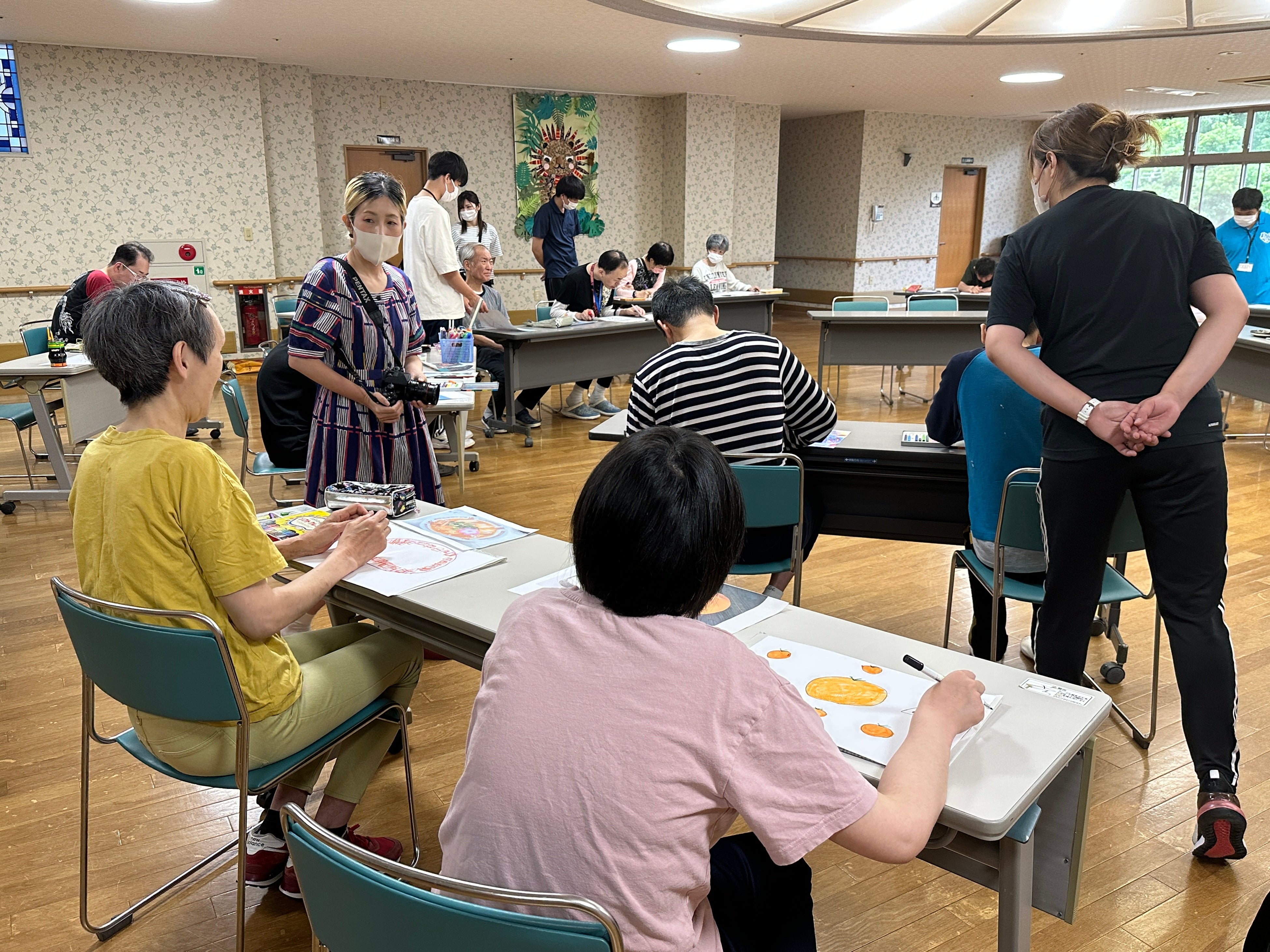 つわぶき会の絵画クラブに参加している方々に、和歌山ふぉんとのパターンになる絵を描いてもらうワークショップをしました。クレヨン、水彩絵の具、マジックペン、コピックなどバラバラで、好きな画材を使って描いています。