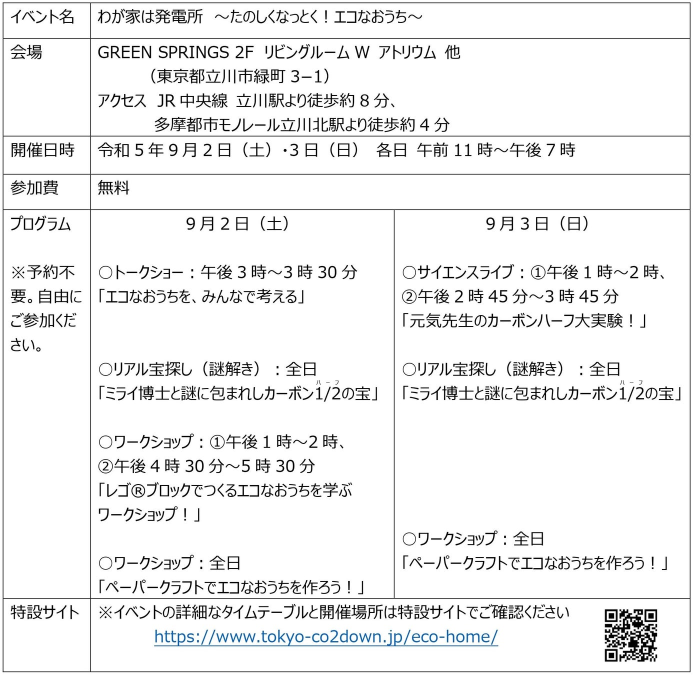 この度、環境性能の高い住宅である「エコなおうち」をより知っていただくため、令和5年9月2日(土)・3日(日)に「わが家は発電所 ~たのしくなっとく!エコなおうち~」と題したイベントを東京都立川市の複合施設GREEN SPRINGSにて開催します。