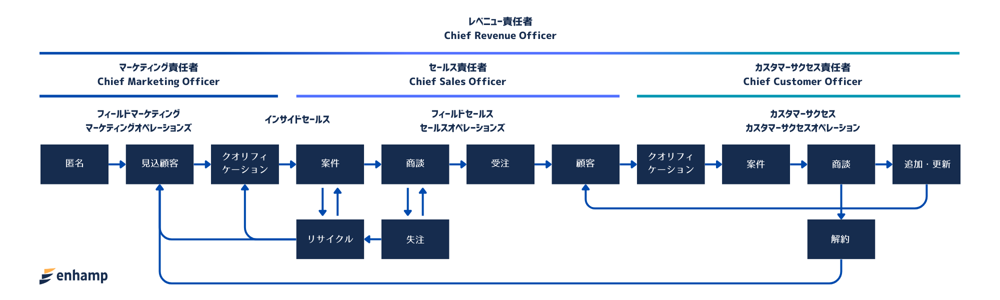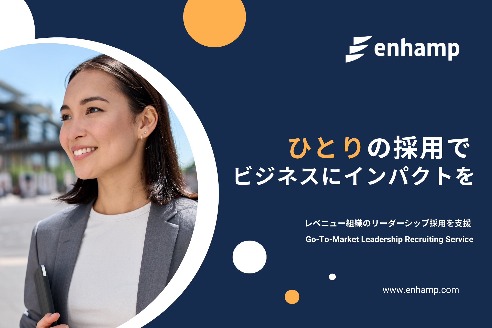 日系・外資系の大手企業やスタートアップにおいて事業成長を牽引してきた経験をもとに、レベニュープロセス全体を捉えた上での組織強化、レベニューイネーブルメント支援を実施しています。マーケティング、セールス、カスタマーサクセスの各業務をプロセス全体にわたって連携させることで、業務の効率化・成長を促進し収益貢献を実現するというレベニューオペレーションの考えをベースに、コンサルティングサービス、セールスイネーブルメントサービス、採用支援サービス、人材育成・キャリア支援サービスを提供しています。ひとりの採用や成長がビジネスに大きなインパクトをもたらす信じ、生産性高く成長しつづけるレベニュー組織と個人の時代にあった価値あるキャリア形成を支援します。詳細については、 https://www.enhamp.com/をご確認ください。