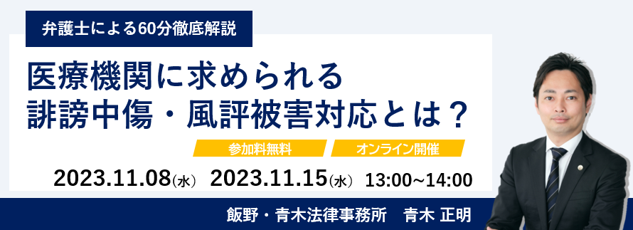 本セミナーでは、Google口コミ・epark・Caloo・ナスコミ・その他転職サイトなどにおける病院・クリニックに対する書き込みへの対応方法を解説いたします。口コミ内容については、「主訴の存在」「個人への誹謗中傷」など様々想定されます。医療機関の風評被害対応に特化した弁護士が、病院・クリニックの口コミ[正青1] への対応方法を分かりやすく解説いたします。