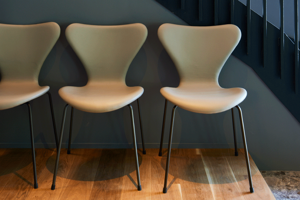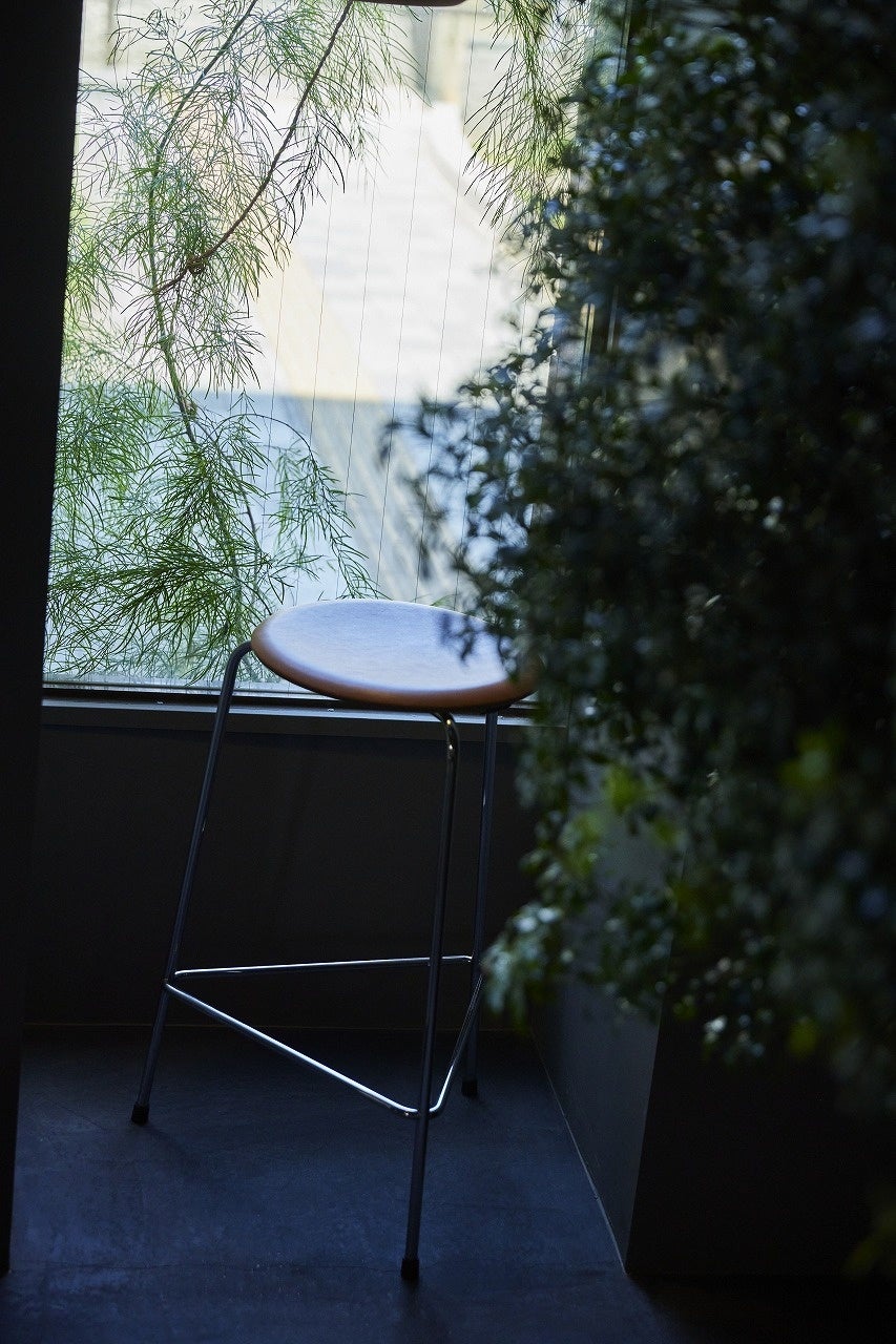 アルネ・ヤコブセンが1955年にデザインしたセブンチェア。フリッツ・ハンセン社を代表するベストセラーであり、家具の歴史においてもアイコン的存在となっています。セブンチェアにはフリッツ・ハンセン社が長く培ってきたものづくりの姿勢が存分に反映されており、同社のプレス成形技術の集大成ともいわれるしなりに強い成形合板を使用しているほか、緩やかなカーブを描く座面、大きな面で優しく支える背もたれなど、長時間座ることを考慮したデザインです。このような品質が座り心地の良さにつながっており、結果的何十年でも「使いたい」と思える魅力につながります。カフェ店内では、シェル全体をレザーで覆ったフルパディング仕様のセブンチェアをご使用いただけます。張地には、滑らかな触り心地が特徴のエッセンシャルレザーを使用しています。汚れやほこり、水に対する耐久性が優れており、大勢の人が利用するカフェでも簡単なお手入れできれいに保てます。パディングによりクッション性があるため、食事をしたり本を読んだり、コーヒーを片手に話したり…カフェで過ごす時間をより心地よいものにしてくれます。