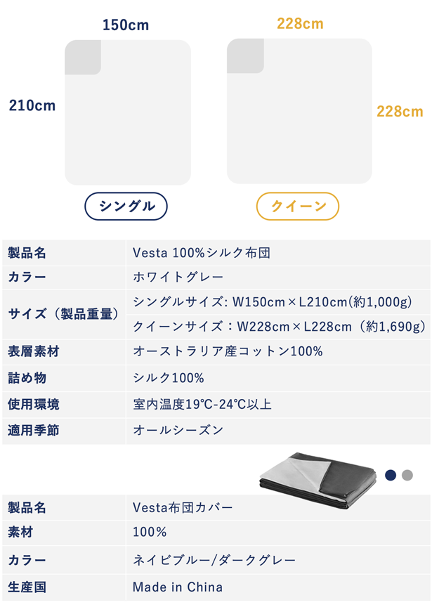 シルクの内部構造は25〜30%のはエアリー構造をしており、通気性が抜群。シルクの細かい小繊維が空気を膨らませ、冬は寒さに負けない保温力を持ちます。Vestaは寝床内の温度を常に19〜24°Cの最適な状態にキープしてくれるため、季節を問わず、フルシーズン使うことが可能です。