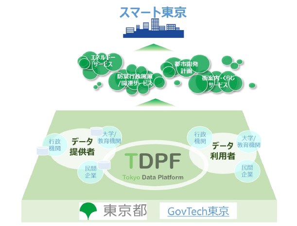 TDPFは、官民の多様な分野のデータが流通するプラットフォームとして、データ利活用に関するルール・運営体制を整備するとともに、行政や企業、大学など様々な主体がつながるコミュニティを形成します。
