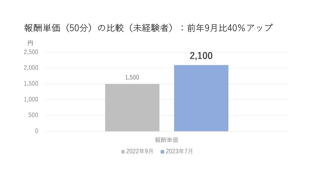 そこで当社では、2023年7月より報酬単価の一律アップを実施致しました。報酬単価の一律アップは、昨年10月に引き続き二度目となり、前年比最大40%のアップとなります。