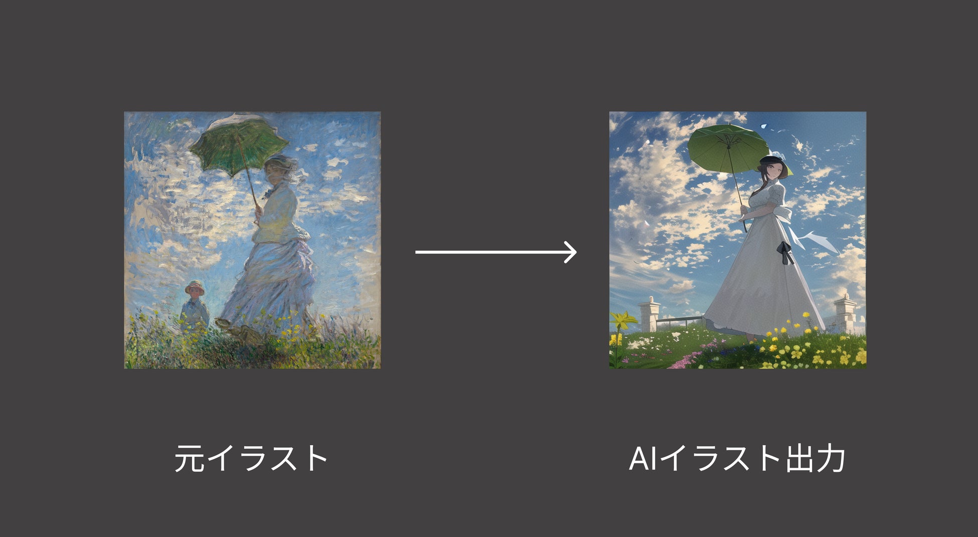 また、元イラストの構図や人物を一定保ったまま、多少の改変を行うAIイラストを出力させた場合が以下の図です。
