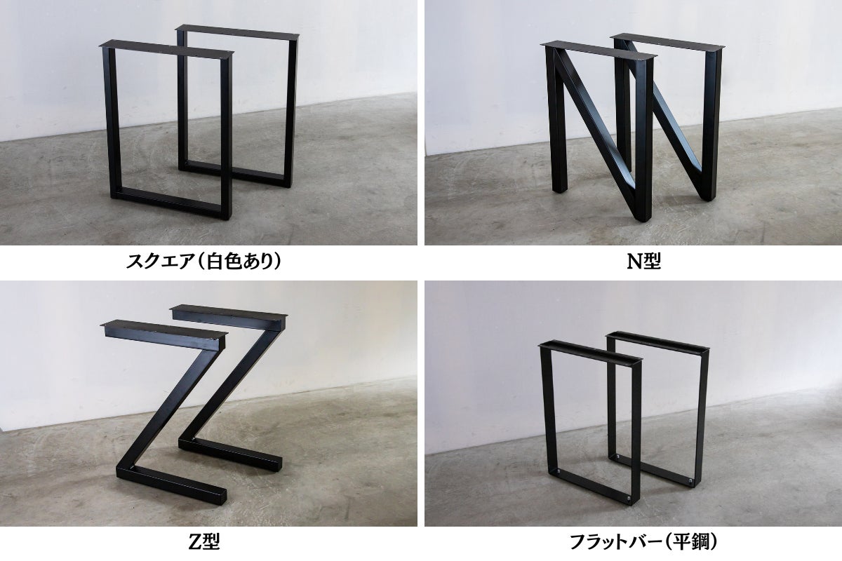 TAKEZEN TABLEはお好みの天板とアイアン脚を自由に組み合わせることができます。アイアン脚はシンプルなスクエア型、ワークデスクにぴったりなZ型、個性あふれるN型、横からの見え方がスリムなフラットバーを使用した脚があります。これらは厳格な精度が求められる板金加工品を請け負っている業者と共同で開発したもので、