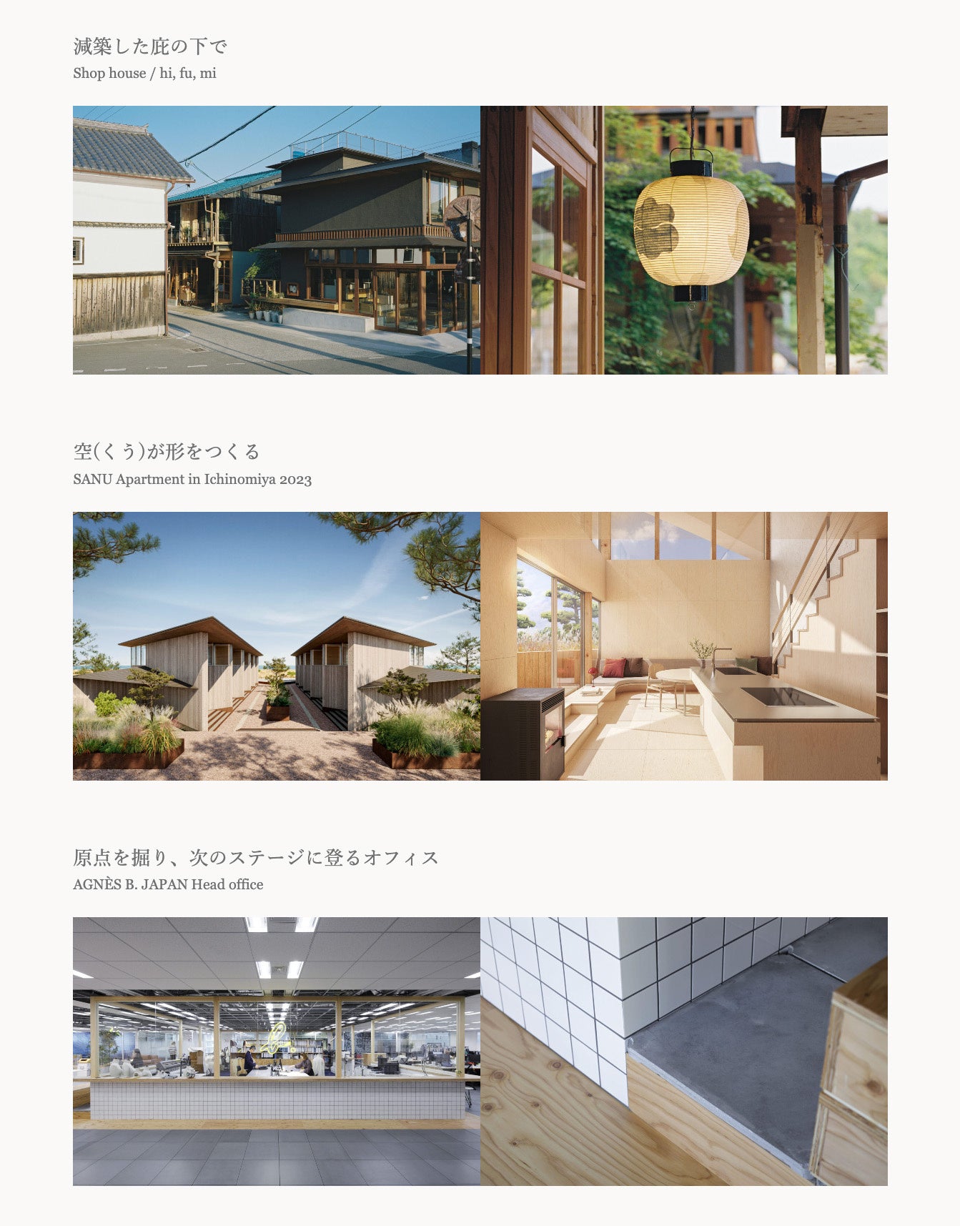 代表作に SANU Apartment in Ichinomiya 2023, sequence MIYASHITA PARK, IWAI OMOTESANDO,KAZAKOSHI Residence,DANDELION CHOCOLATE( 2017~),% ARABICA(2013年~2019年) など。
