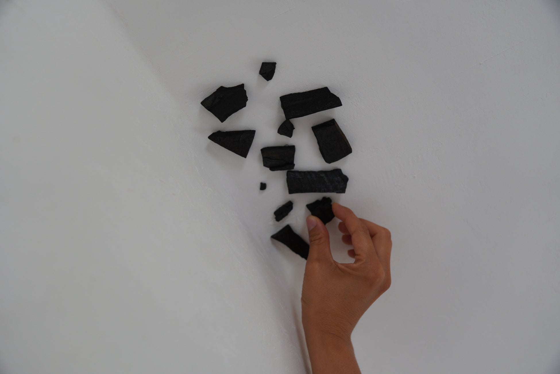 宿泊記念としてお客様に寝室の天井に小さな炭のピースを貼り付けていただき、約1年かけて仕上げていきます。